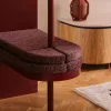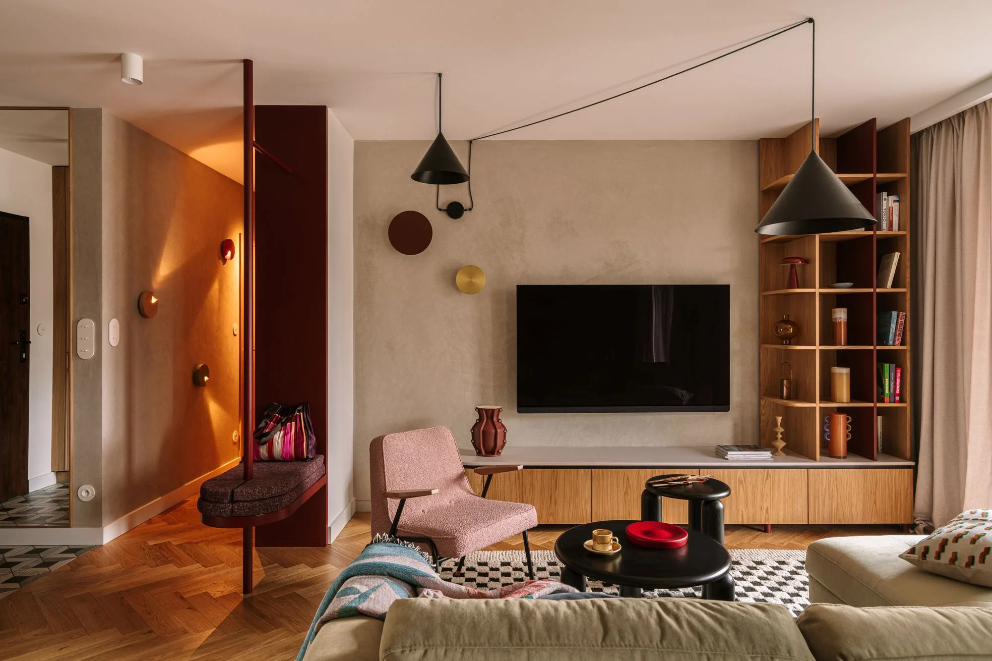 Strefa wejściowa to pierwszy znak, że tu nie będzie nudno. Po jednej stronie pojemna szafa – bo praktyczność nie musi być nudna. Po drugiej – obłe bordowe siedzisko, które wygląda jakby miało własną osobowość. Ten element, zlicowany z zabudową na drobiazgi, tworzy rzeźbiarską kompozycję, spójną z obłościami obecnymi w kuchni i meblu RTV. Małe arcydzieło, które wita gości z rozmachem, ale i humorem.