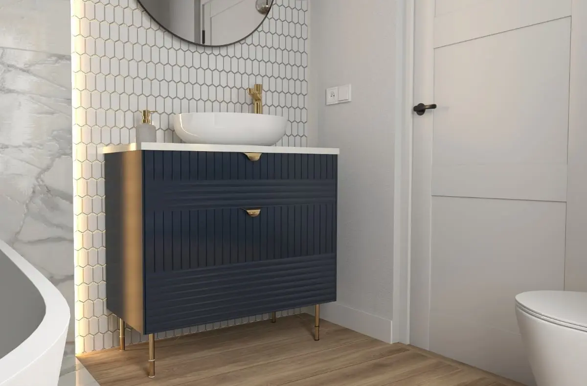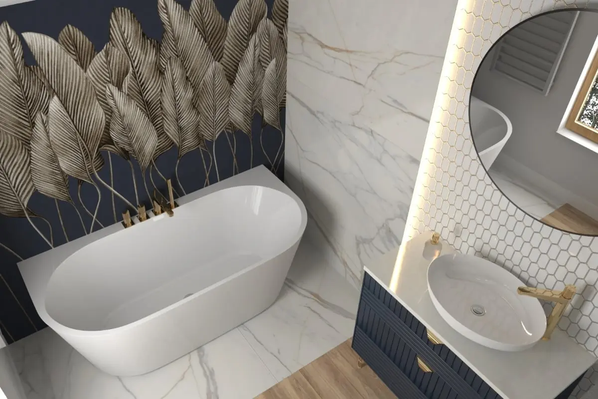Centrum niebieskiej łazienki stanowi niezwykła tapeta One Wall Design z serii Sapenzie, umieszczona za wanną. Ta wyjątkowa tapeta nadaje całej łazience niezapomnianego uroku i klasy. Znajdują się tutaj wyraźnie wydzielone strefy, z których każda ma swoje unikalne cechy. Strefa kąpielowa jest osadzona w eleganckiej ramie z marmuru, co nadaje jej wyjątkowej elegancji. W strefie umywalkowej dominuje heksagonalna mozaika, która wnosi do wnętrza elementy geometrii i niebanalności. Szafka umywalkowa z granatowym ryflowanym frontem, wolnostojąca umywalka oraz złota armatura i okucia meblowe nawiązują do stylu glamour.