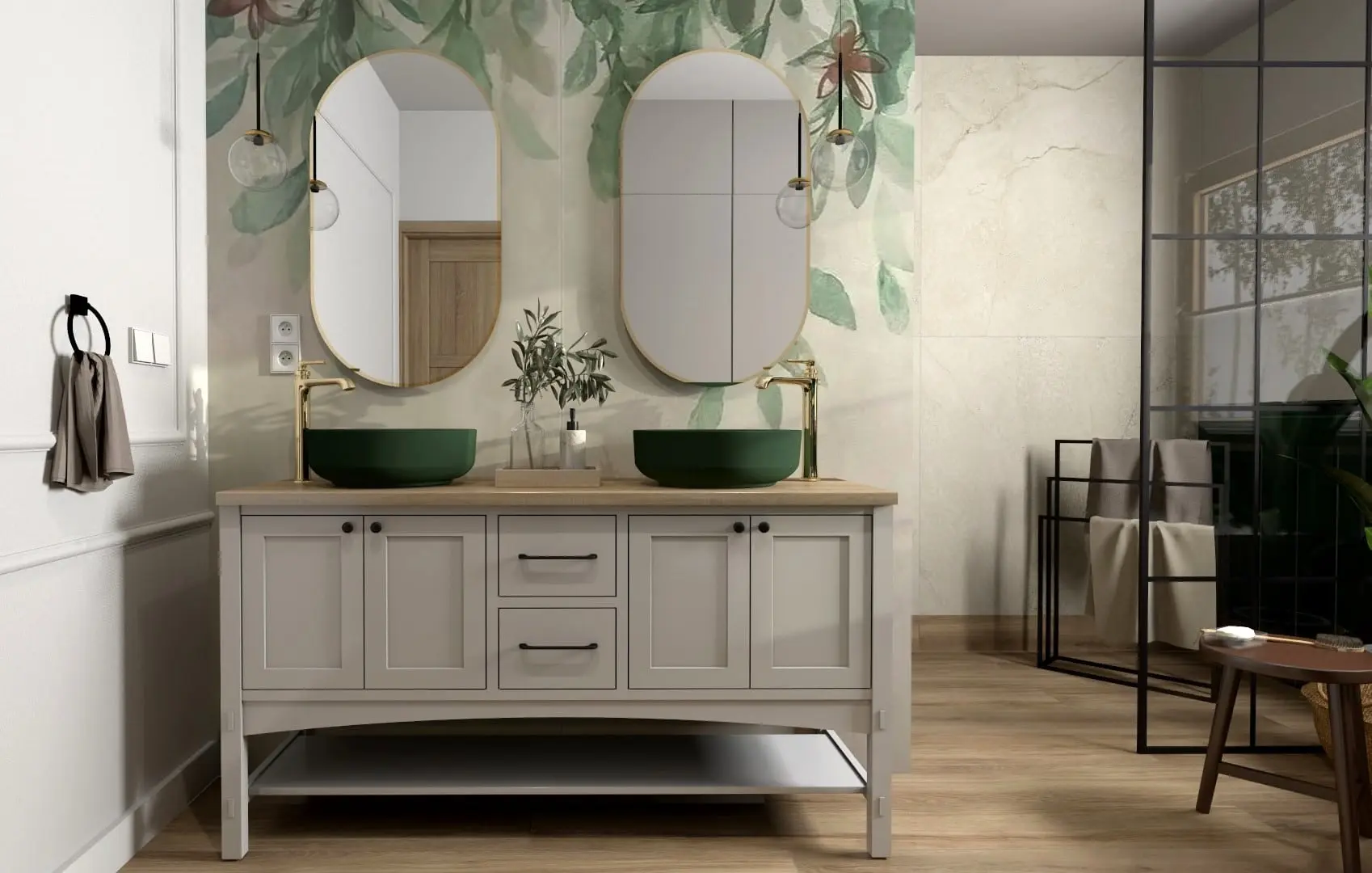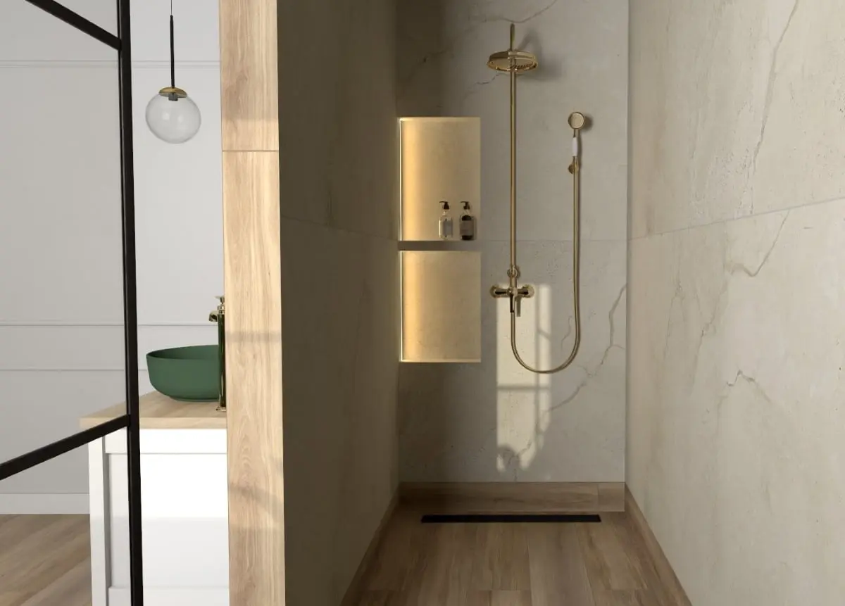 Naturalne materiały i kontrasty stanowią kluczowy element tego projektu. Drewnopodobne płytki na podłodze oraz spieki z teksturą kamienia pod prysznicem tworzą harmonijny kontrast, podkreślając naturalny charakter wnętrza. Wyjątkowy dekoracyjny gres wielkoformatowy z roślinnym wzorem przyciąga uwagę i nadaje wnętrzu niepowtarzalnego charakteru.