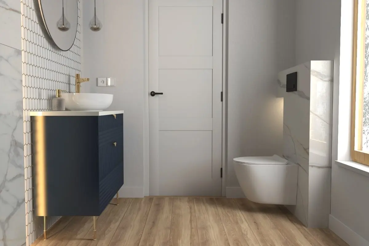 Podłoga w łazience pokryta jest drewnopodobnymi płytkami, które nadają wnętrzu przytulności i ciepła. Kolorystyka skupia się głównie na głębokim błękicie, co tworzy wyjątkowy nastrój luksusu i wyrafinowania.
