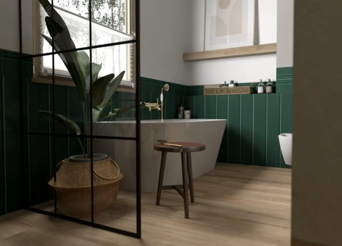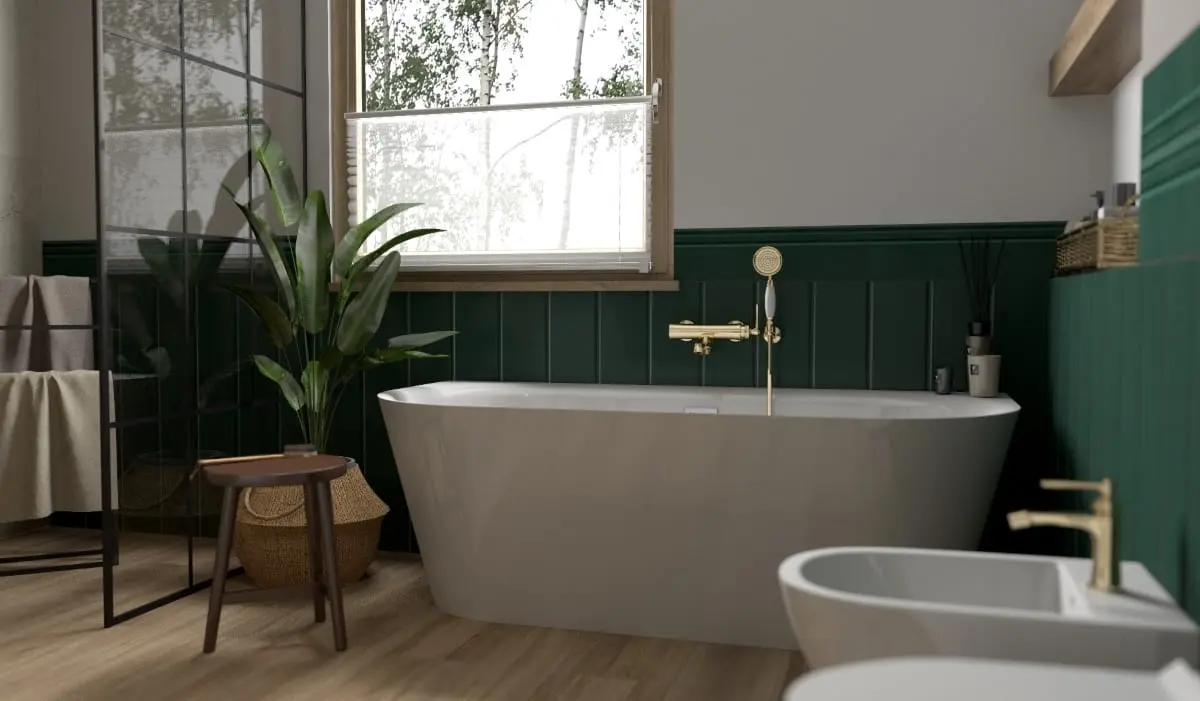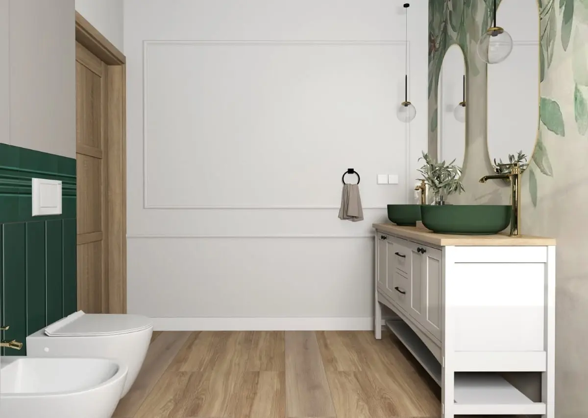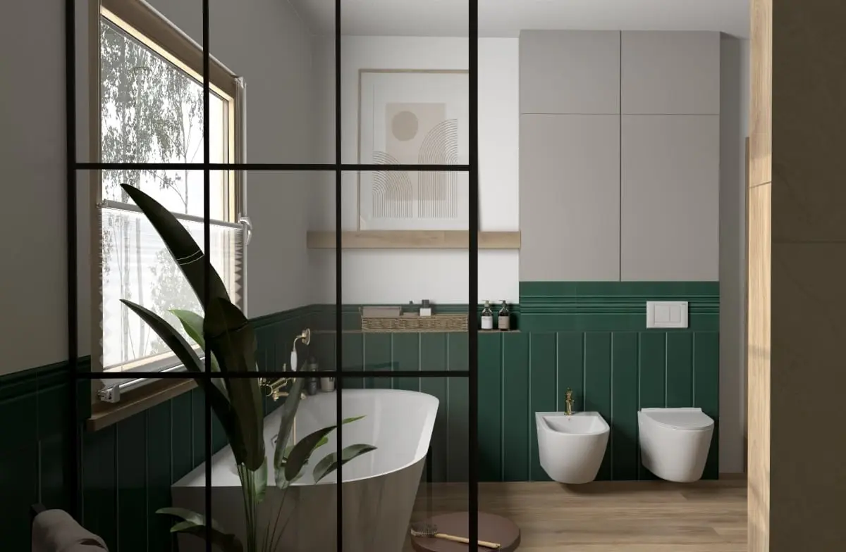 Łazienka w szmaragdowej zieleni, wyróżnia nietuzinkowe połączenie boho z eleganckim stylem angielskim. W tej przestrzeni wydzielono trzy strefy: kąpielową, umywalkową oraz prysznicową. Najbardziej charakterystycznym elementem jest lamperia wykonana z głęboko zielonych płytek, nadająca wnętrzu niezwykłego uroku.