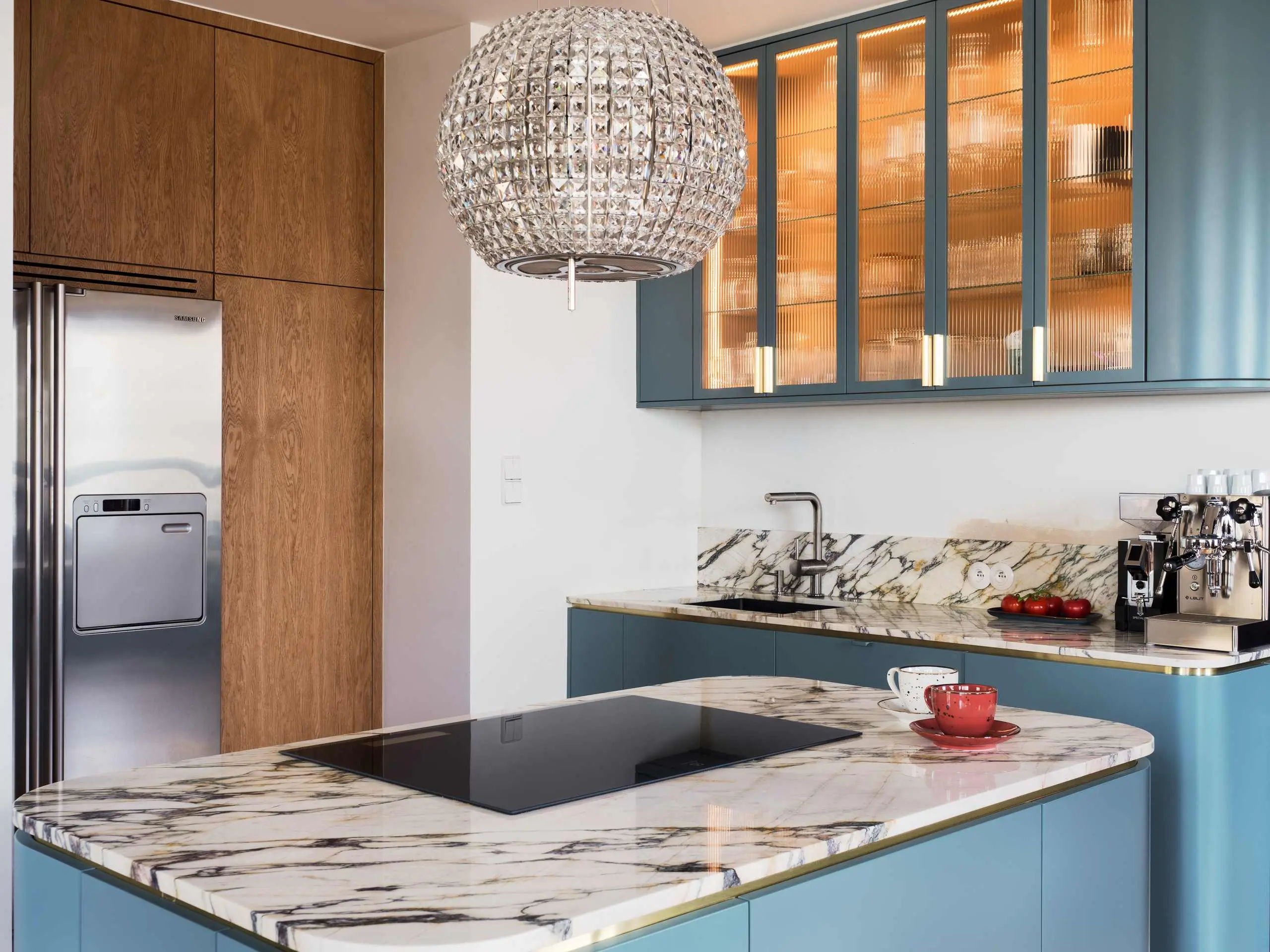 Kolor frontów początkowo miał powtarzać burgundowe żyłki marmurowego blatu, ale finalnie postawiono na stonowany odcień turkusu. Ten kolor wspaniale podkreśla mniej widoczne kolory kamienia – zielone oraz złote przebarwienia.