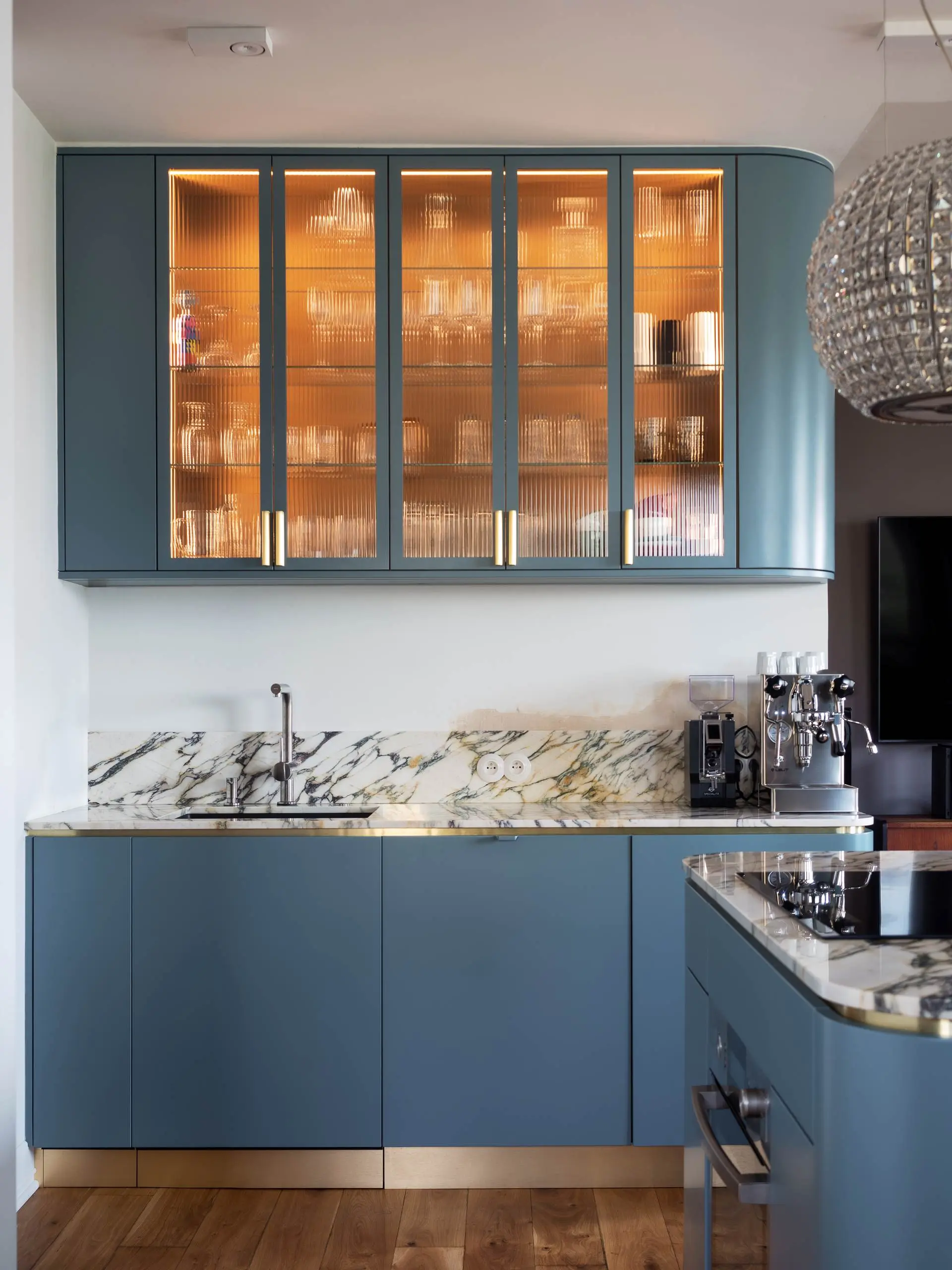 Wiele pracy poświęciliśmy detalom: doboru dębowego forniru z najpiękniejszym rysunkiem słojów, znalezieniem flutowanego szkła, które będzie najbardziej klarowne i najładniej będzie załamywało światło, znalezieniem odpowiednich uchwytów, finalnie sprowadzonych z Australii. Wszystko po to, by spędzanie w niej czasu było najprawdziwszą przyjemnością.