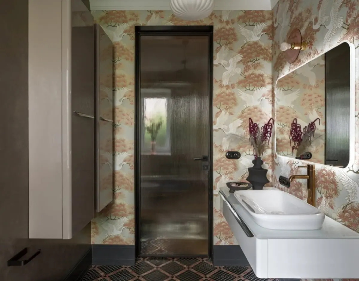 Doskonałym na to przykładem jest wystrój łazienki, która stanowi esencję kobiecości – prawdziwe królestwo właścicielki. Podkreśla ją subtelna paleta barw, krągłe formy mebli i wyposażenia oraz niezwykle zdobne detale.. Przytulne beże i czekoladowe brązy tworzą tu subtelne tło dla w całości wybranego z oferty jednego producenta marki Geberit wyposażenia, utrzymanego w podobnej palecie barw. Jego obłe, inspirowane nieregularnymi kształtami wprost ze świata przyrody formy, podkreślają pierwiastek żeński w aranżacji. Uwagę przyciąga zaś orientalna tapeta z motywem żurawi, które w Japonii są symbolem szczęścia, wierności i długowieczności. Jej delikatny wzór oraz pastelowe odcienie wnoszą kolejną nutę kobiecości. Efekt ten podkreśla, dodatkowo, róż marmurowej posadzki, ułożonej w modernistyczną kratkę oraz armatura i dodatki w kolorze różowego złota. Wśród tych ostatnich na szczególną uwagę zasługuje przycisk Geberit Sigma, z wykończeniem z naturalnego łupka.