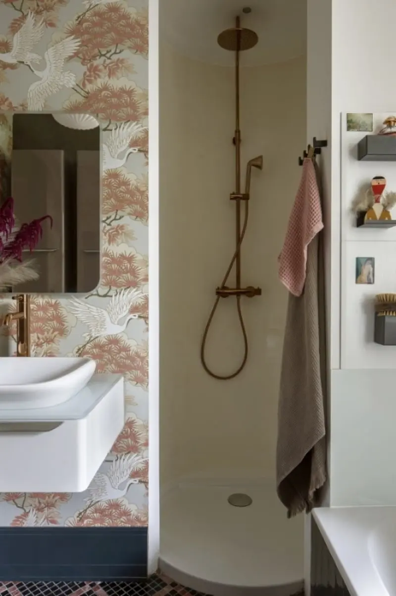 Projektując łazienkę w moim apartamencie zależało mi na stworzeniu unikatowego, indywidualnego wnętrza. Lubię vintage, dlatego spodobały mi organiczne kształty mebli Geberit MyDay. Orientalna tapeta jest dodatkowo podkreślona przez podświetlane lustro z tej samej serii. Różowe złoto baterii pasuje do matowego przycisku Sigma o podobnym wykończeniu