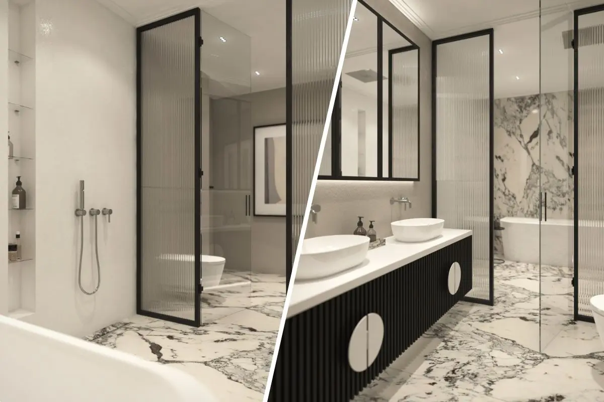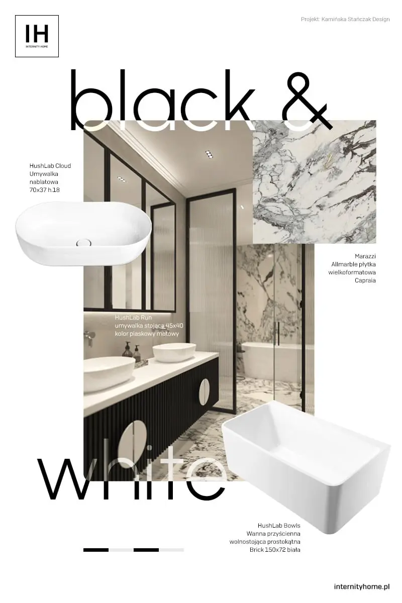 Wnętrze jest utrzymane w monochromatycznym klimacie black & white. Pomimo ograniczonej palety barw, aranżacja zaskakuje na wielu płaszczyznach. Bazę projektu stanowią wyraziste marmurowe płytki wielkoformatowe Marazzi z kolekcji Allmarble. Całość dopełniają czarne detale w formie ram luster oraz przeszklenia wydzielającego strefę kąpielową. Czerń pojawia się również na drapowanych frontach szafki podumywalkowej. Zabawa fakturą uatrakcyjnia czarno – białą aranżację.