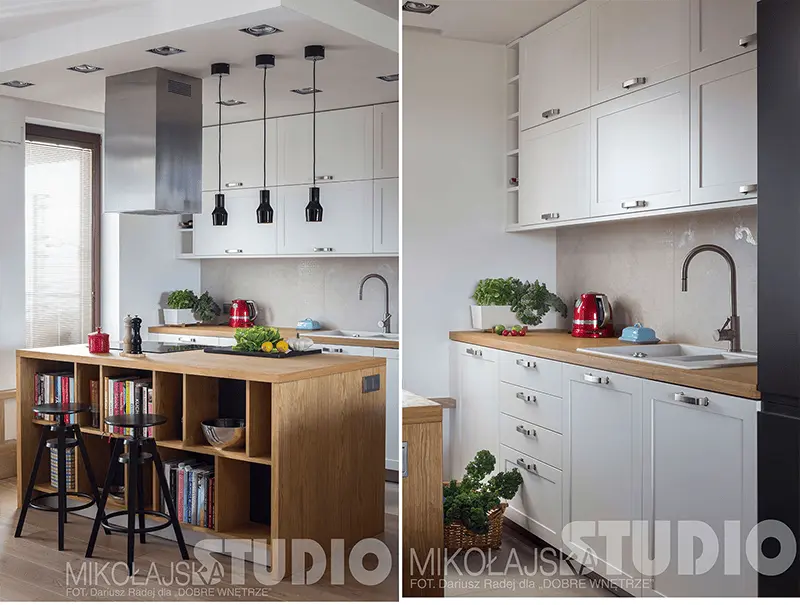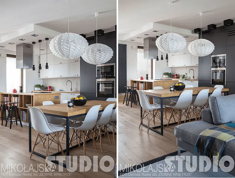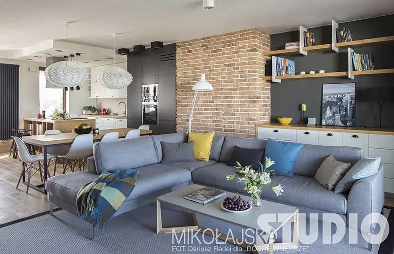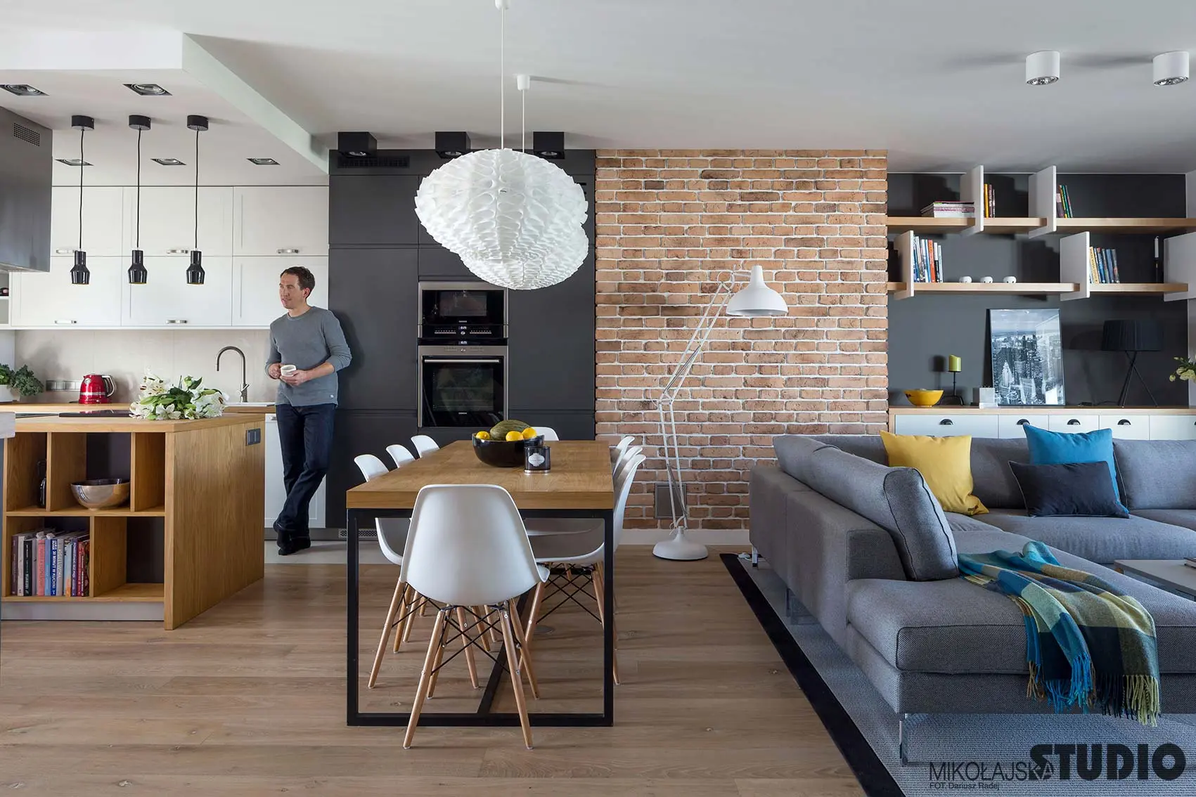 Nowocześnie, ale nie minimalistycznie… Loftowo, ale i przytulnie – taki jest projekt wnętrza zaprezentowanego w dzisiejszym wpisie. Strefa dzienna jest otwartą przestrzenią i pomimo wykorzystania industrialnych elementów, takich jak techniczne oświetlenie czy ściana wyłożona ceglanymi płytkami, uwodzi przytulnością. Taki efekt udało się osiągnąć dzięki charakterystycznemu podejściu do projektowania architektki Krystyny Mikołajskiej (Mikołajska Studio) – troszkę koloru, czerwona cegła, drewno, szczypta loftowego chłodu i od razu robi się stylowo.