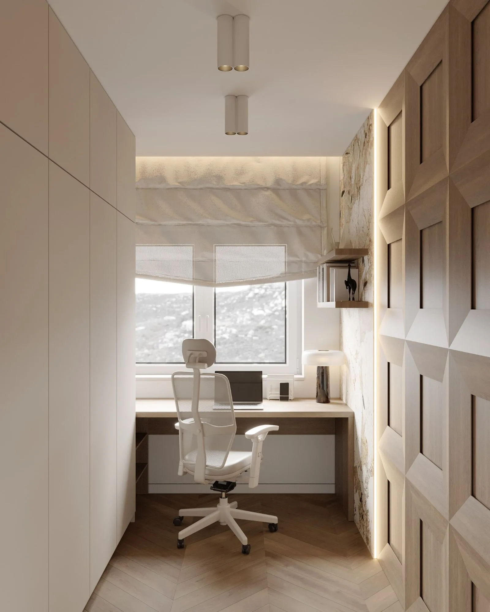 Gabinet, mimo niewielkich rozmiarów, został zaprojektowany tak, by zapewniać komfort pracy. Minimalistyczne biurko i wygodne krzesło współgrają z resztą wnętrza, nie dominując przestrzeni.