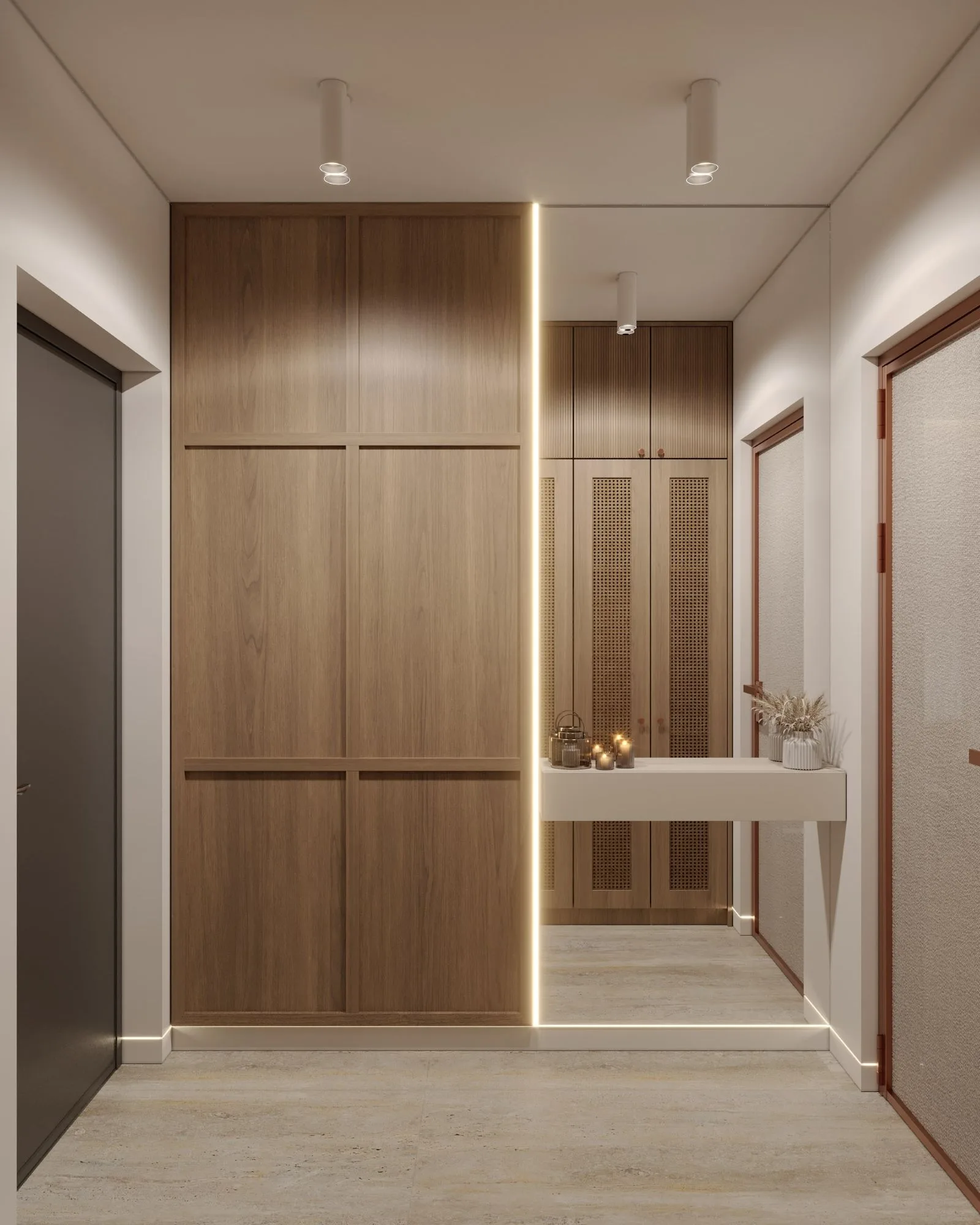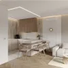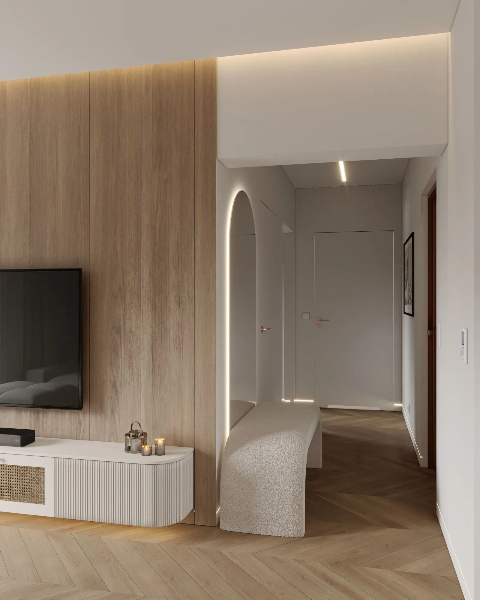 Dominujące w mieszkaniu kolory to biel i odcienie beżu, które budują spokojny, relaksujący nastrój. Mieszkanie uzupełniają miękkie tkaniny, takie jak welur czy len, które dodają przytulności i zapraszają do odpoczynku. Wszystko to zostało wzbogacone o elementy z naturalnego drewna i marmuru, które nadają wnętrzom luksusowego charakteru.