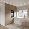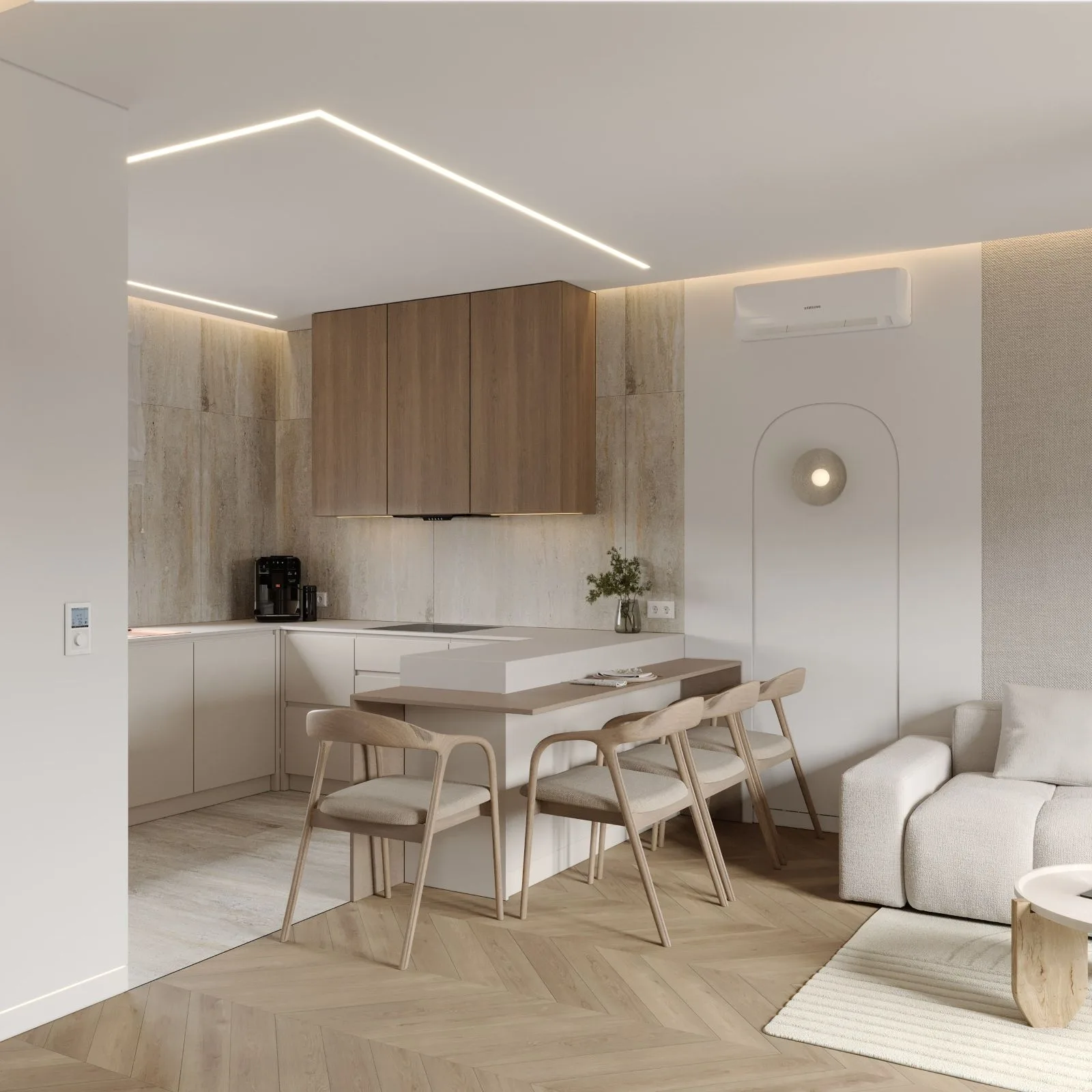 Otwarta kuchnia na salon sprzyja codziennemu życiu i integracji domowników. Strefa dzienna została zaprojektowana tak, by była zarówno estetyczna, jak i praktyczna. Minimalistyczne meble o harmonijnych kształtach współgrają z przestrzenią, zapewniając wygodę i poczucie porządku.