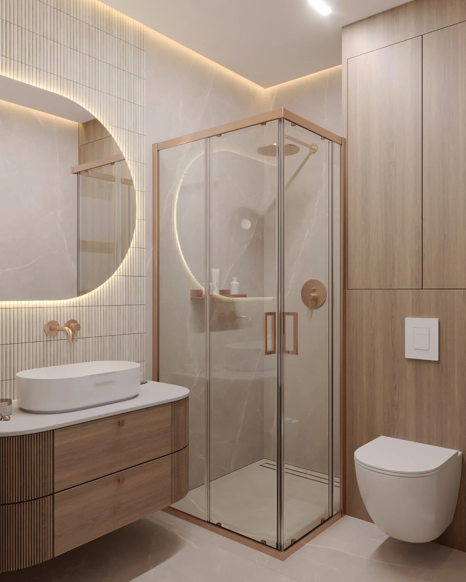 Łazienka w tym mieszkaniu to prawdziwe domowe spa. Wykorzystano w niej połączenie bieli i drewna, co tworzy eleganckie, ale ciepłe wnętrze. Duża, wygodna strefa prysznicowa oraz dyskretne oświetlenie sprzyjają relaksowi po długim dniu.