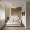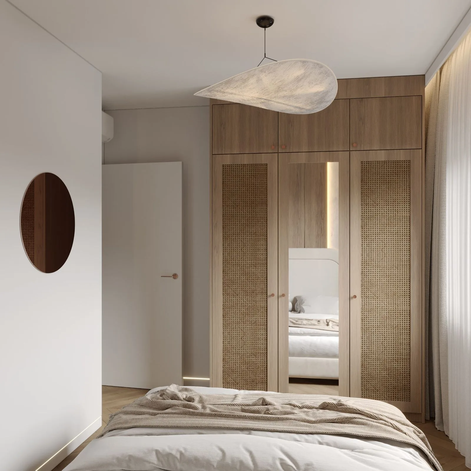 Sypialnia to oaza spokoju. Znajdują się w niej jedynie najpotrzebniejsze elementy: łóżko z wezgłowiem wykończonym miękką tkaniną, delikatne zasłony i subtelne oświetlenie. Wszystko utrzymane w jasnych, neutralnych barwach, które sprzyjają odpoczynkowi.