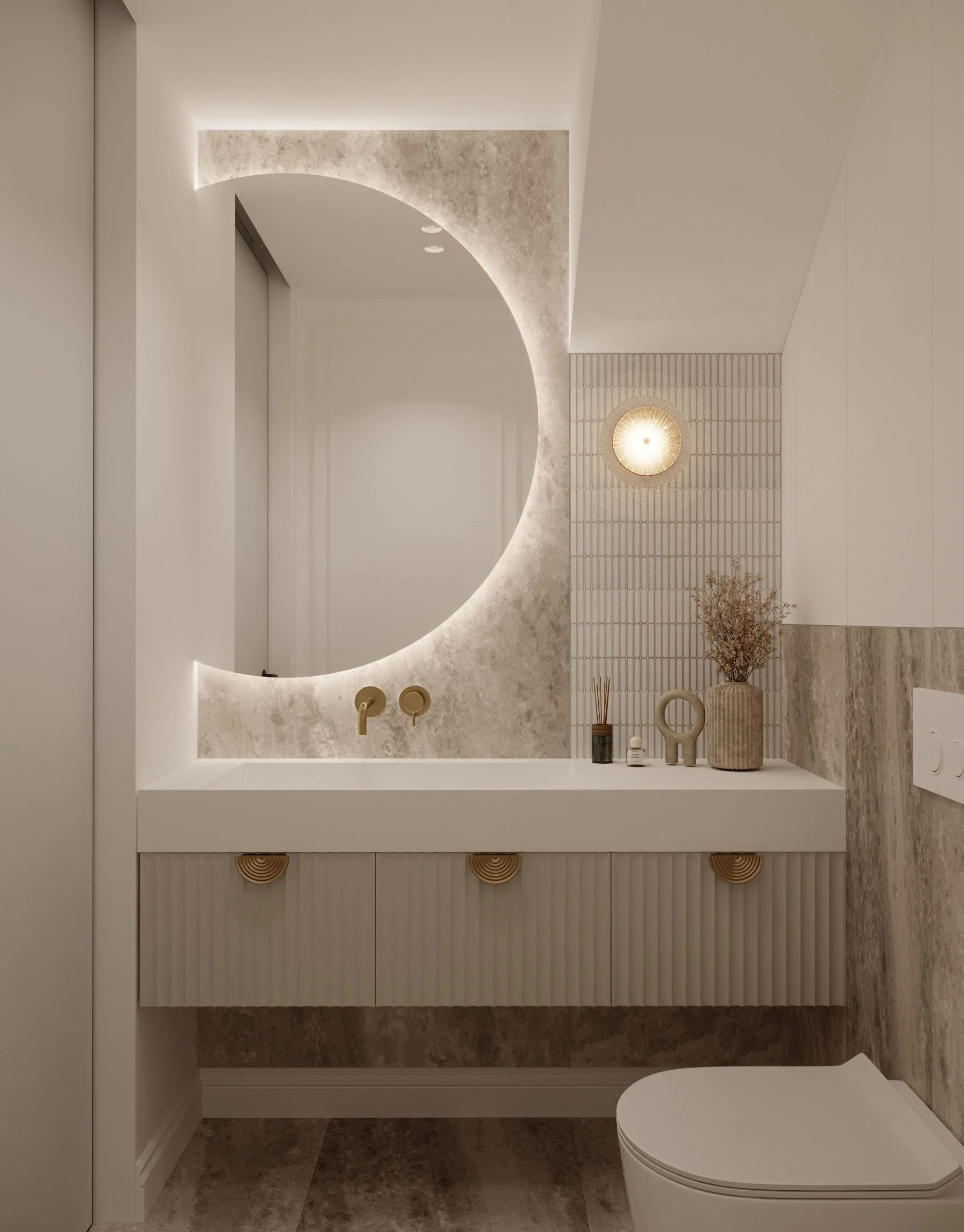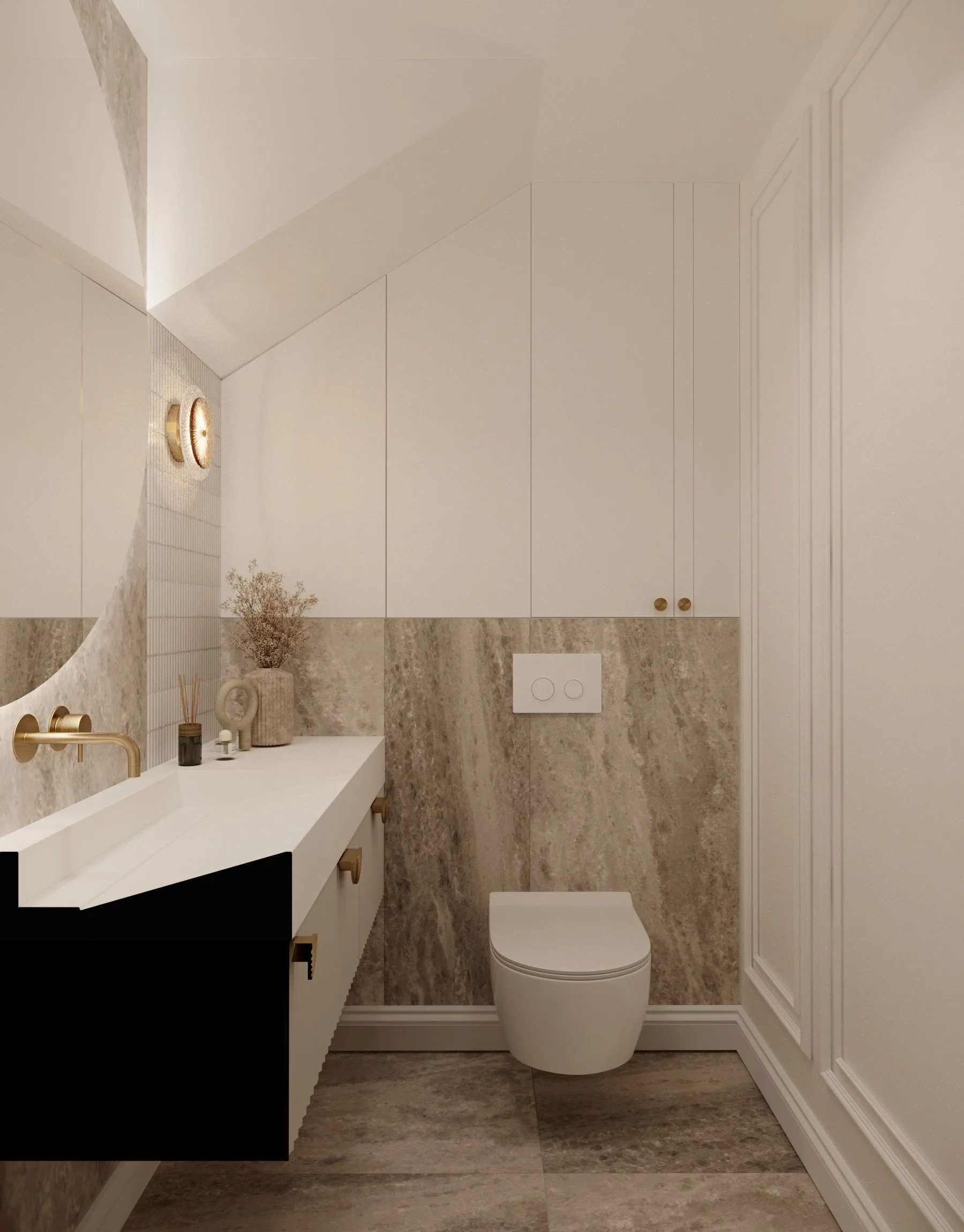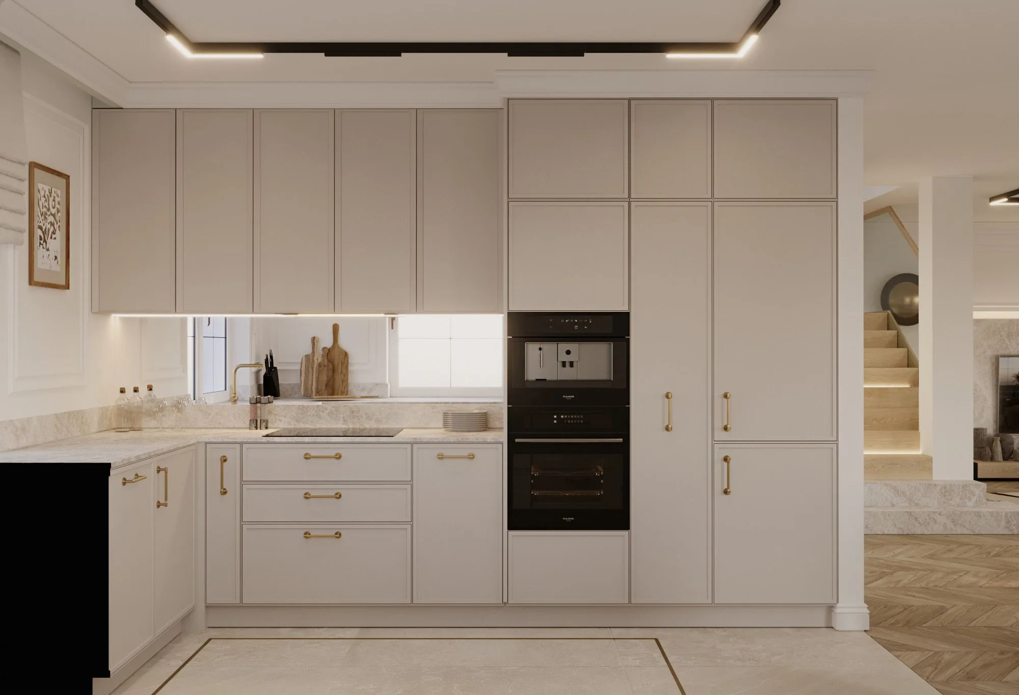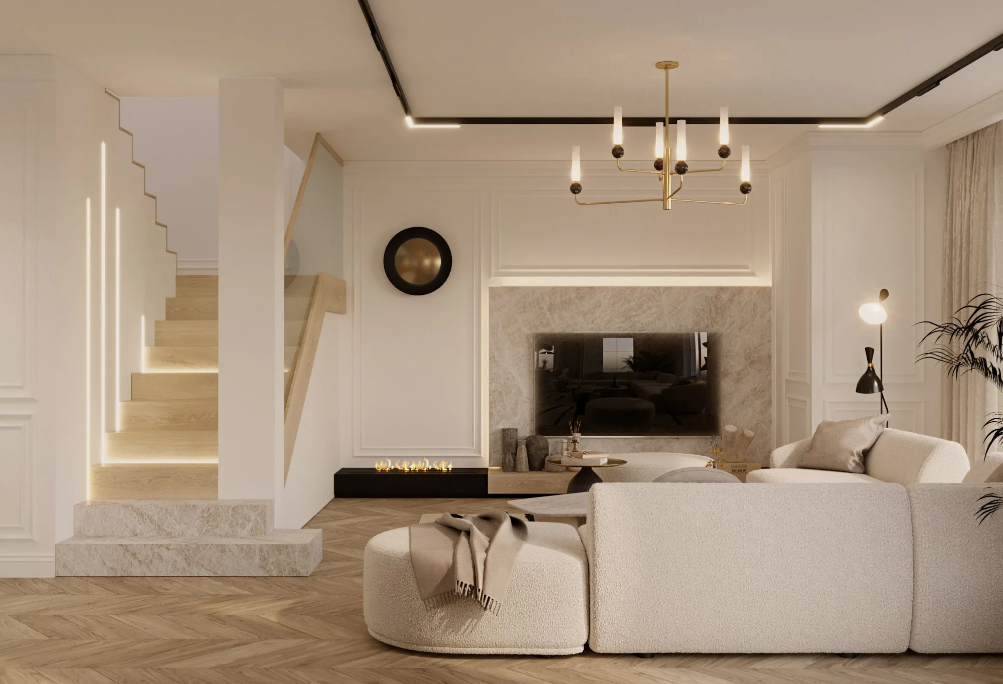 Stąd w projekcie pojawiają się drewniane podłogi w delikatnych odcieniach, jedwabne zasłony, kaszmirowe koce czy wełniane dywany. Są one nie tylko elementem wystroju, ale i wyrazem dbałości projektantki o szczegóły. Także kamień – marmur i trawertyn dyskretnie przewijają się przez wnętrza, pojawiają się w detalach takich jak blaty, stoły, a nawet fronty mebli, nadając wnętrzom subtelnej elegancji. Wszystko jest tu wyważone – tekstury i materiały współgrają ze sobą, tworząc atmosferę luksusu, który nie przytłacza.