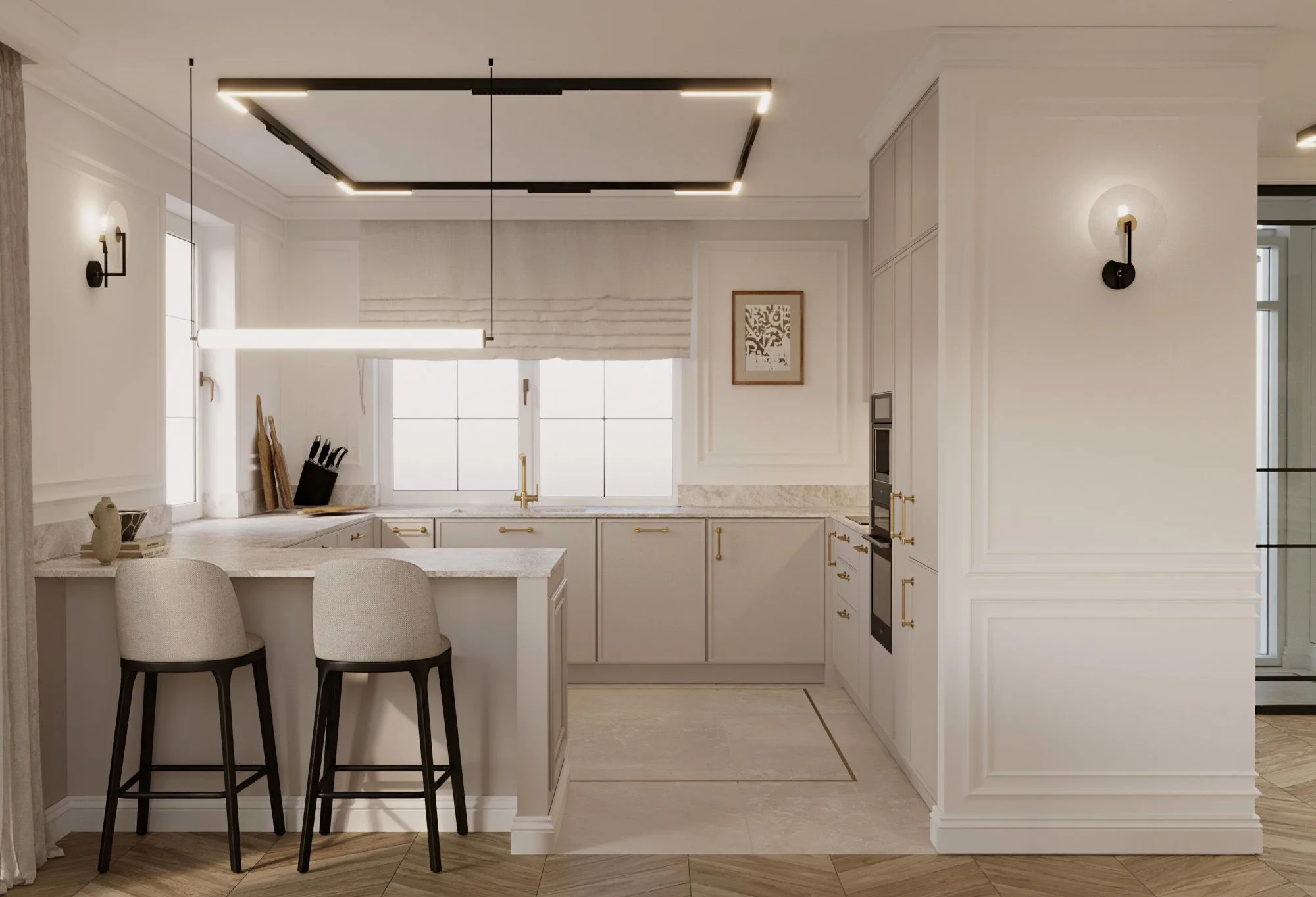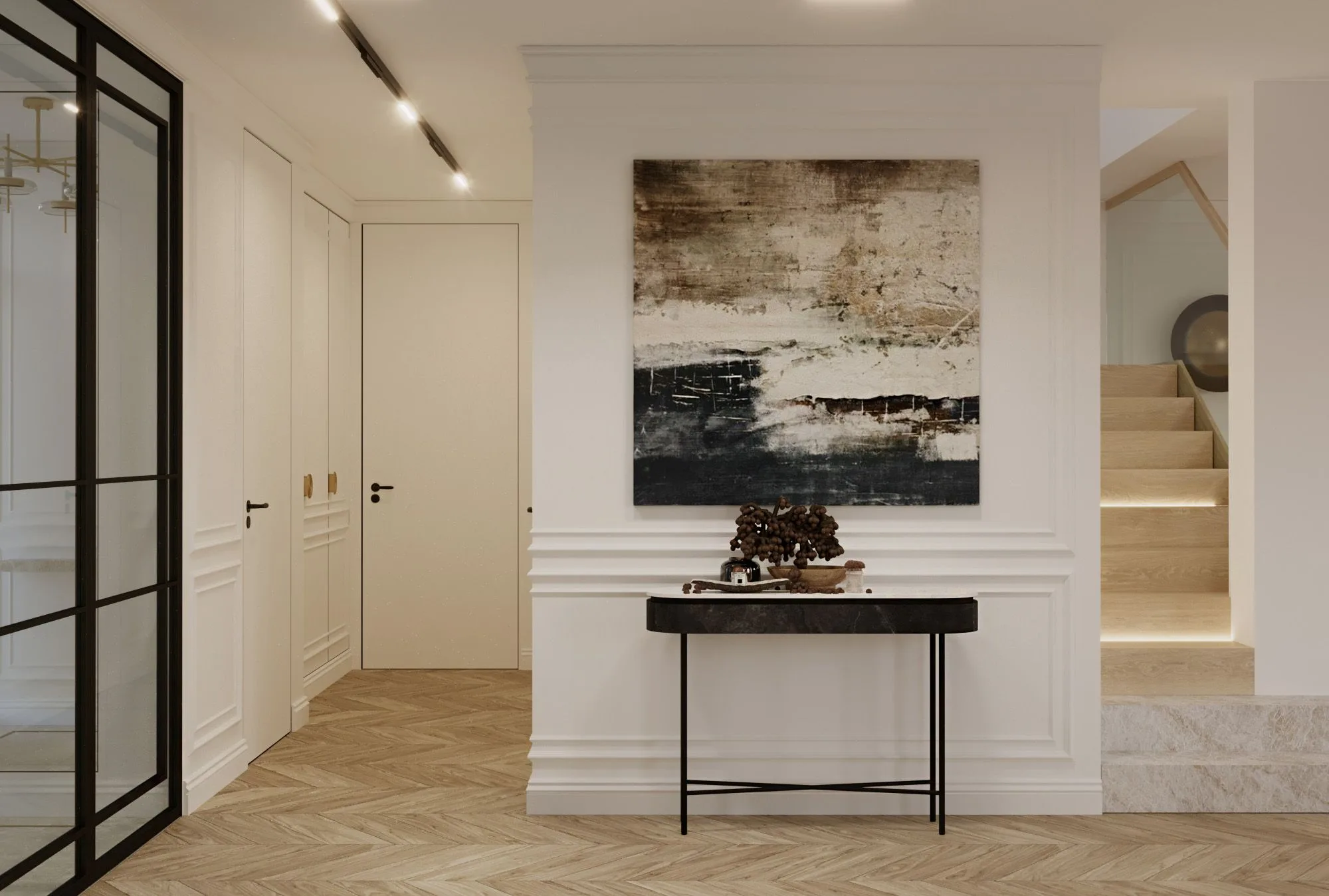 O tym, jak ważna jest siła detali przekonuje wprowadzona do wnętrz czerń, która niczym lejtmotyw przewija się w postaci zdecydowanych akcentów przez wszystkie pomieszczenia. Czarne szprosy w przeszkleniach, listwy sufitowe, czy elementy zdobne mebli i wyposażenia dodają pazura, nie zakłócając przy tym panującej tu harmonii. To przestrzeń, która nie krzyczy, ale subtelnie mówi o dobrym guście i miłości do piękna w najbardziej wysmakowanej formie.