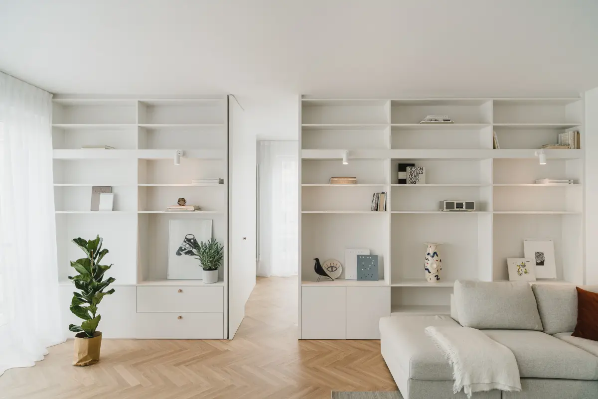 Dodatkowe wrażenie przestronności daje otwarty układ mieszkania. Ścianami jest wyizolowana jedynie łazienka. Przestrzeń salonu i sypialni oddziela regał z dużą ilością półek, w który są wkomponowane drzwi. Dodatkowymi elementami, które wyróżniają mebel spośród tradycyjnych meblościanek, są kinkiety zastosowane w nietypowy sposób.