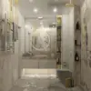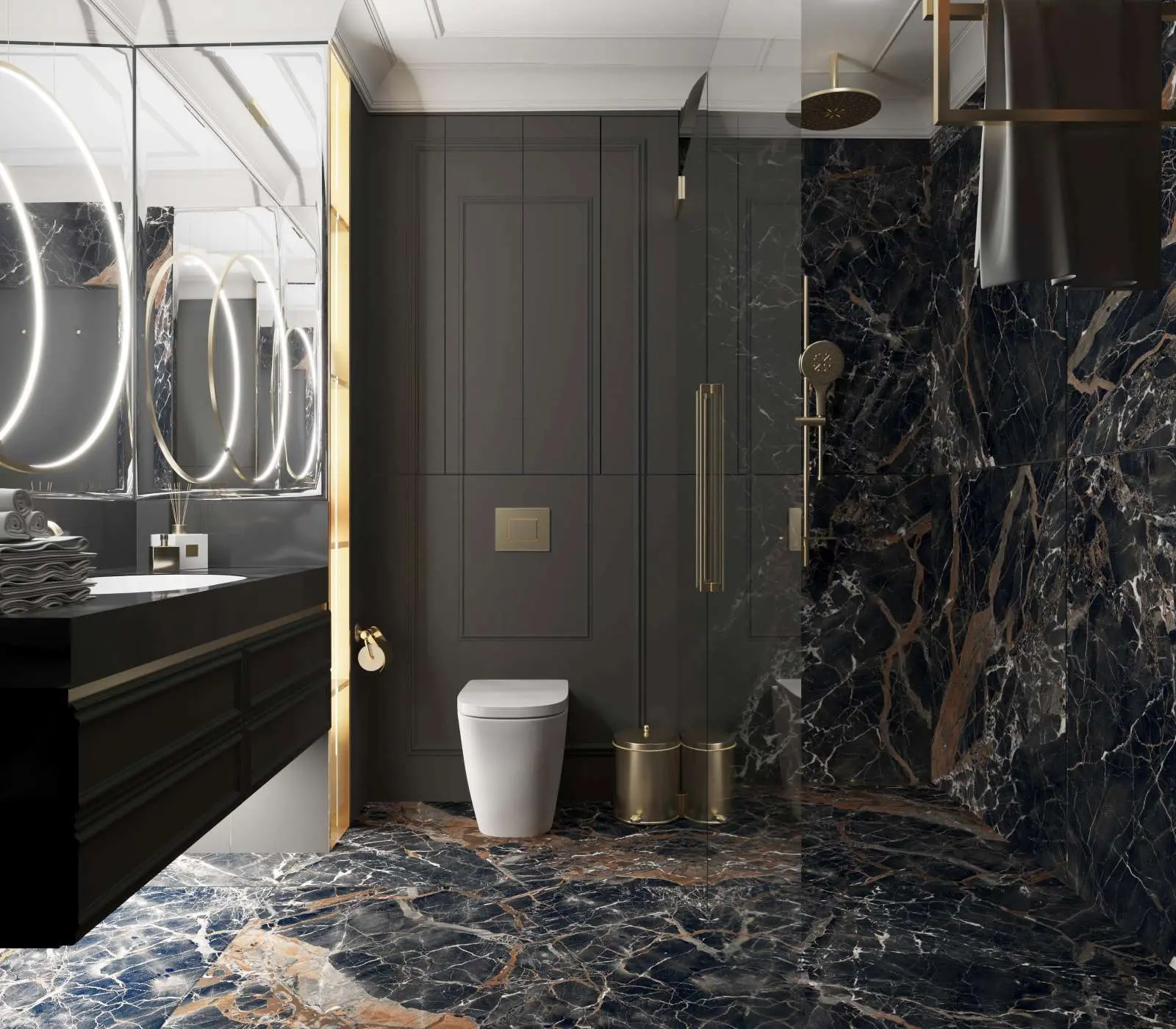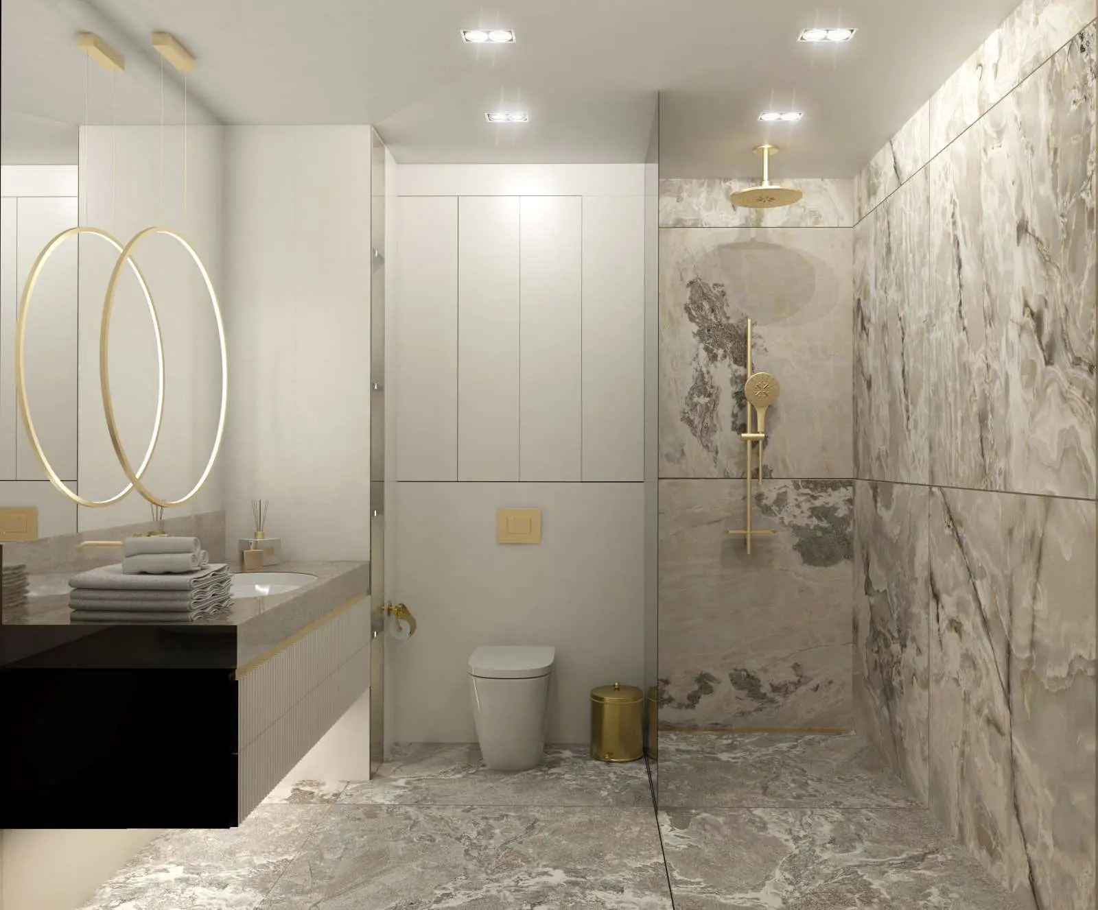 Łazinki miały wyglądać elegancko i ze smakiem. Punktem, od którego zaczęto projekt był właśnie dobór kolorystyki nowej łazienki. Wybór padł na mocne i zdecydowane płytki marmurowe beżowe oraz czarne. W łazienkach w stylu glamour dominują wyraziste kolory, a najczęściej spotykane to złoto, srebro, czerń, beż. Styl ten cechuje się ponadto stosowaniem zaskakujących i kontrastowych zestawień. W pierwszej propozycji łazienki architekt zastosowała szarą ceramikę, która znakomicie współgra z płytką jak również ze złotą armaturą.