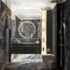 Druga propozycja łazienki w stylu eleganckiego glamour to zdecydowana czerń zestawiona z białą ceramiką i również złotą armaturą. Kusząco połyskujące złote detale, z pewnością stają się tu gwiazdą aranżacji, podkreślając jej wytworny charakter! W tej aranżacji architekt sięgnęła po więcej klasycznych elementów jak sztukateria.