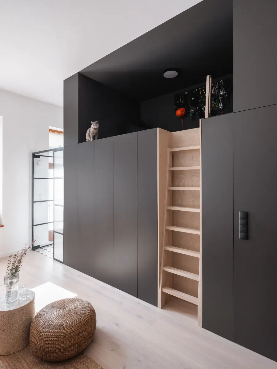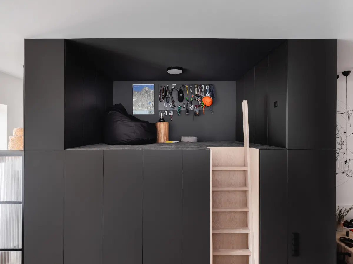 Na wprost salonu znajduje się mini antresola, która wtopiła się w grafitową bryłę wielofunkcyjnego prostopadłościanu pełniącego funkcję garderoby. Tam znajduje się kącik na szpej, czyli oprzyrządowanie wspinacza. Pasję architektki podkreśla obraz.