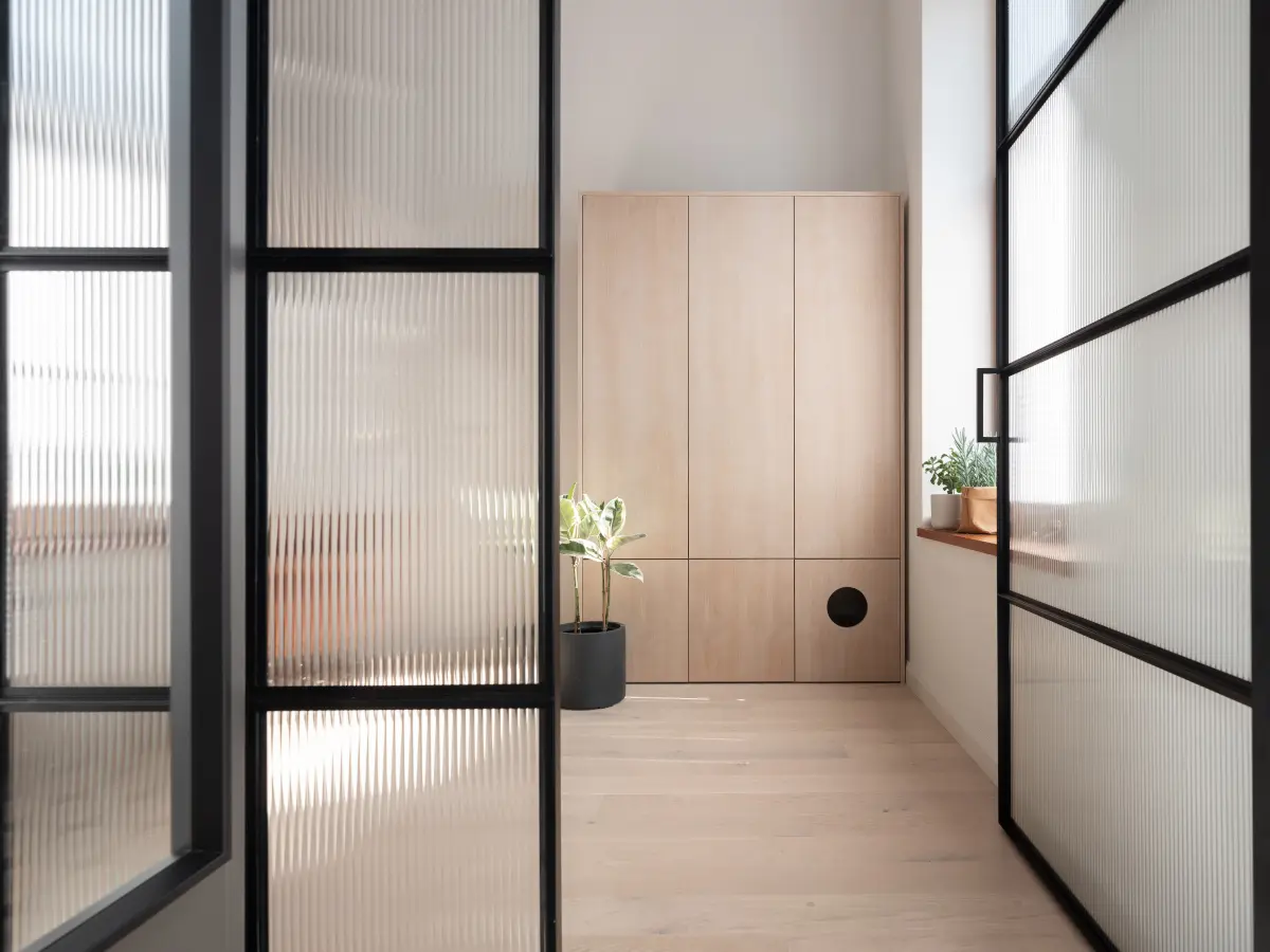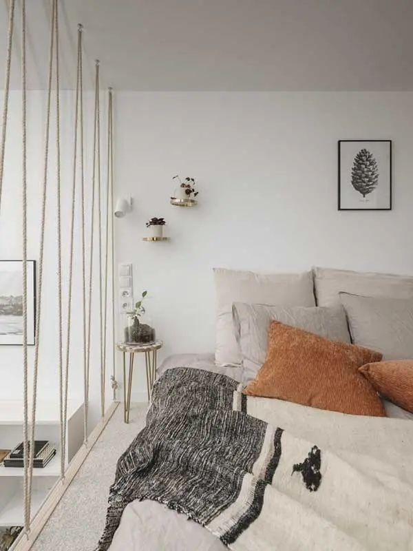 Pod antresolą znajduje się pokój gościnny pełniący funkcję dyskretnego kąciku do noclegu przyjaciół i rodziny, która często odwiedza Panią domu. Łóżkiem dla gości jest japoński futon. Jego zaletą jest kompaktowa forma i niezwykła wygoda. Architektka przewidziała również zasłonkę na wypadek gdyby goście potrzebowali odrobinę prywatności.
