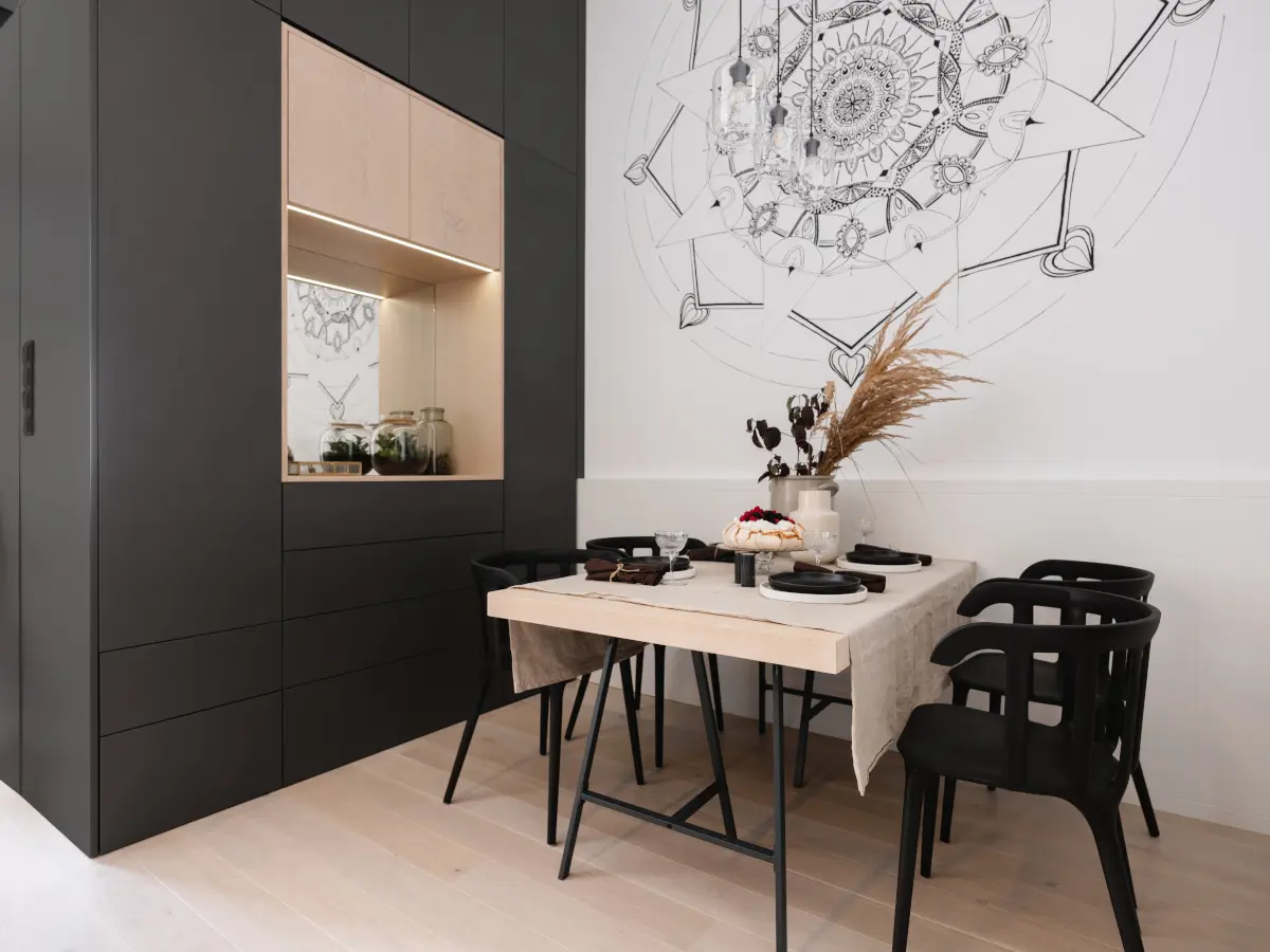 W tym przypadku powiedzenie, że kuchnia jest sercem domu, jest jak najbardziej na miejscu, bowiem znajduje się w samym centrum mieszkania – nieważne w jakim kierunku byśmy nie podążali, zawsze przechodzimy przez kuchnię. Kolejnym plusem otwartej kuchni jest dostęp do światła dziennego a także możliwość integracji z gośćmi podczas przygotowywania posiłków.