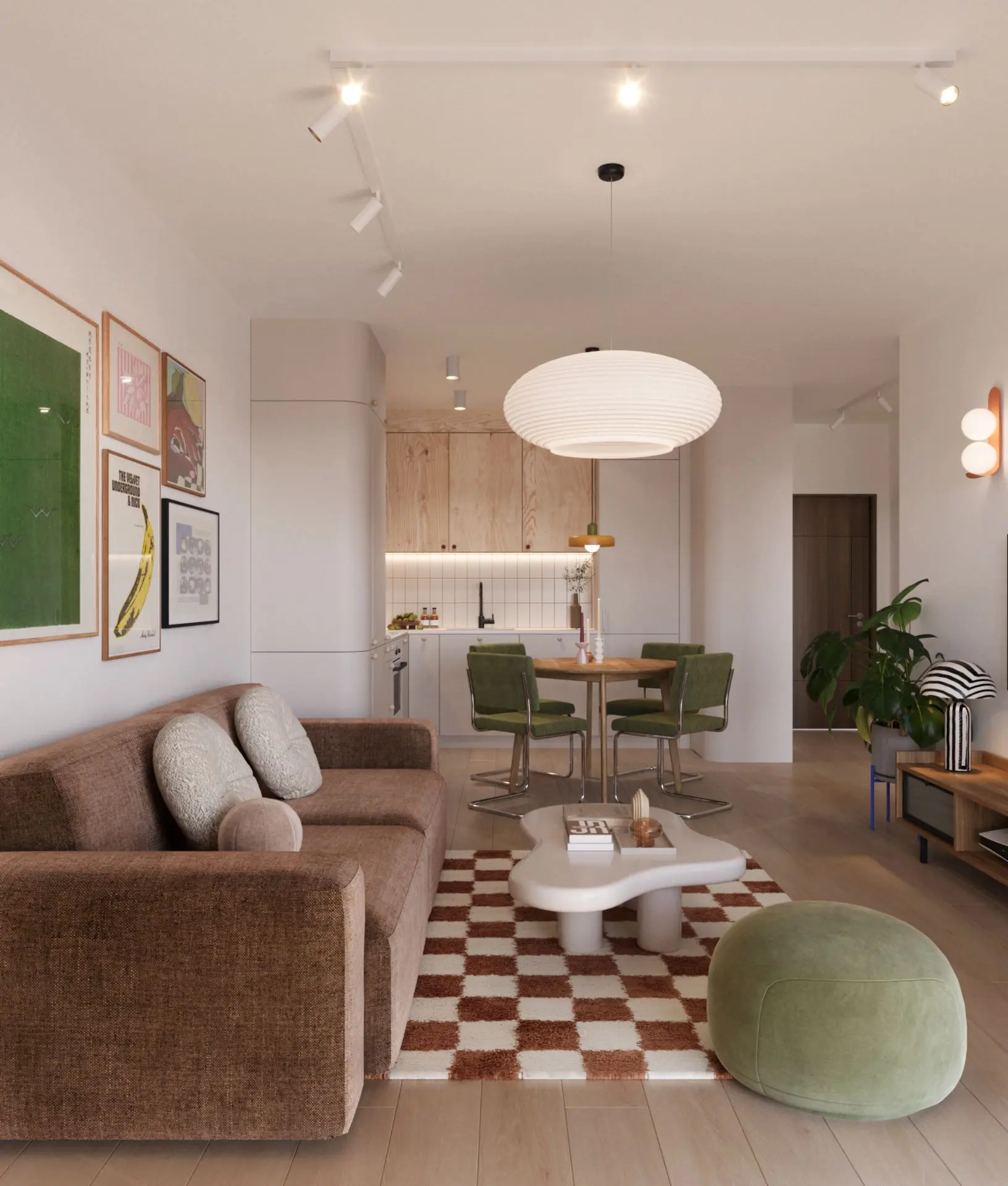 Projektanci skupili się na stworzeniu przestrzeni, która jest nie tylko funkcjonalna, ale również estetycznie atrakcyjna. Połączenie nowoczesnych linii z ciepłymi, retro akcentami tworzy wnętrze, które jest zarówno stylowe, jak i przytulne. Delikatne barwy ścian, stylowe dodatki i dobrze dobrane oświetlenie tworzą wrażenie większej przestrzeni i dodają wnętrzu charakteru.
