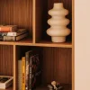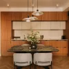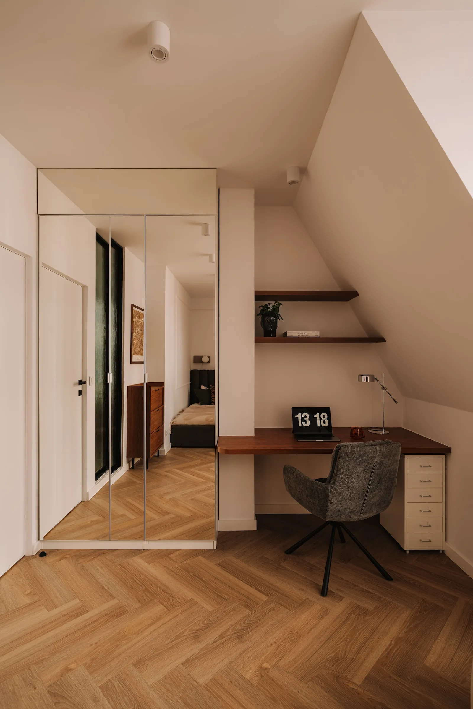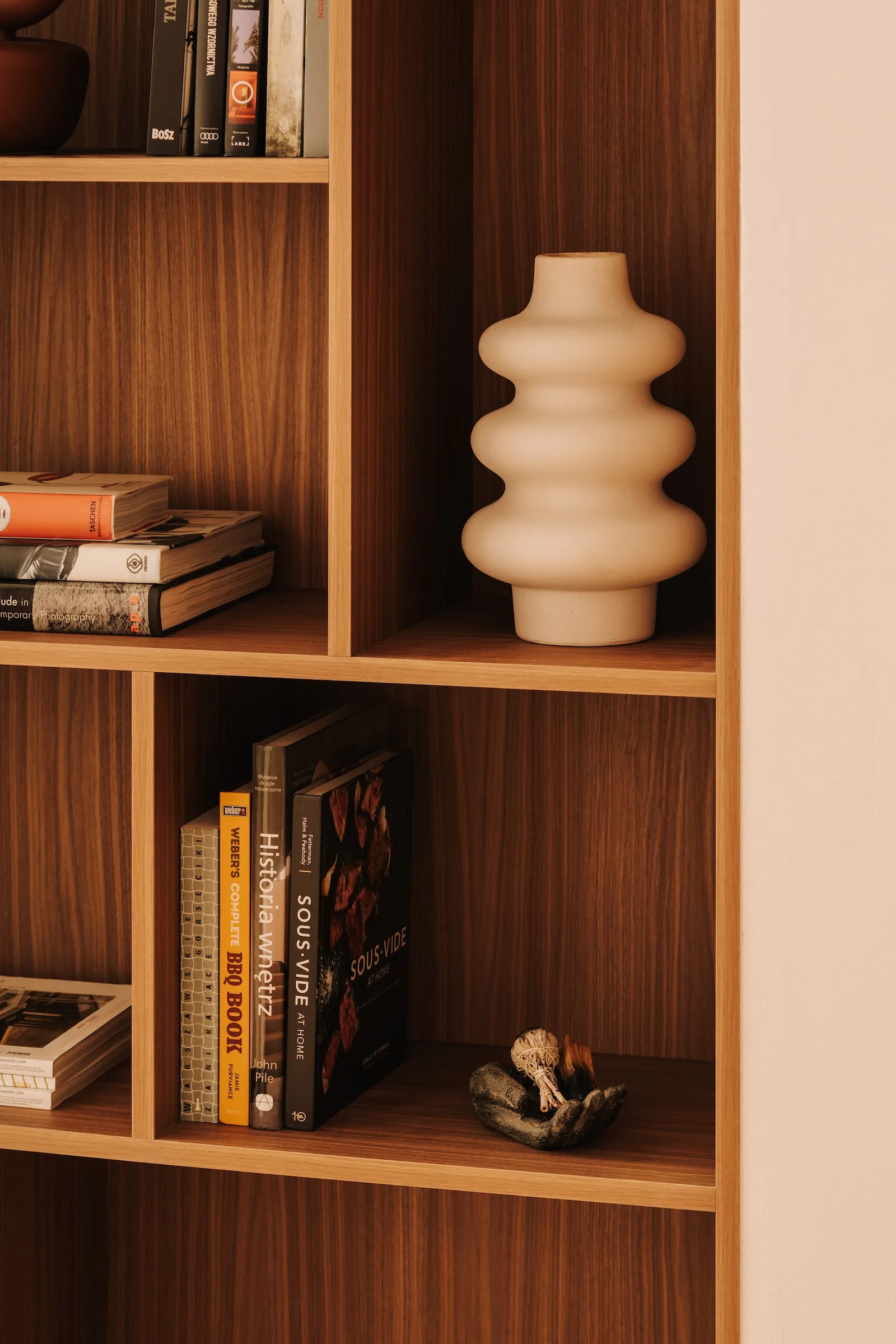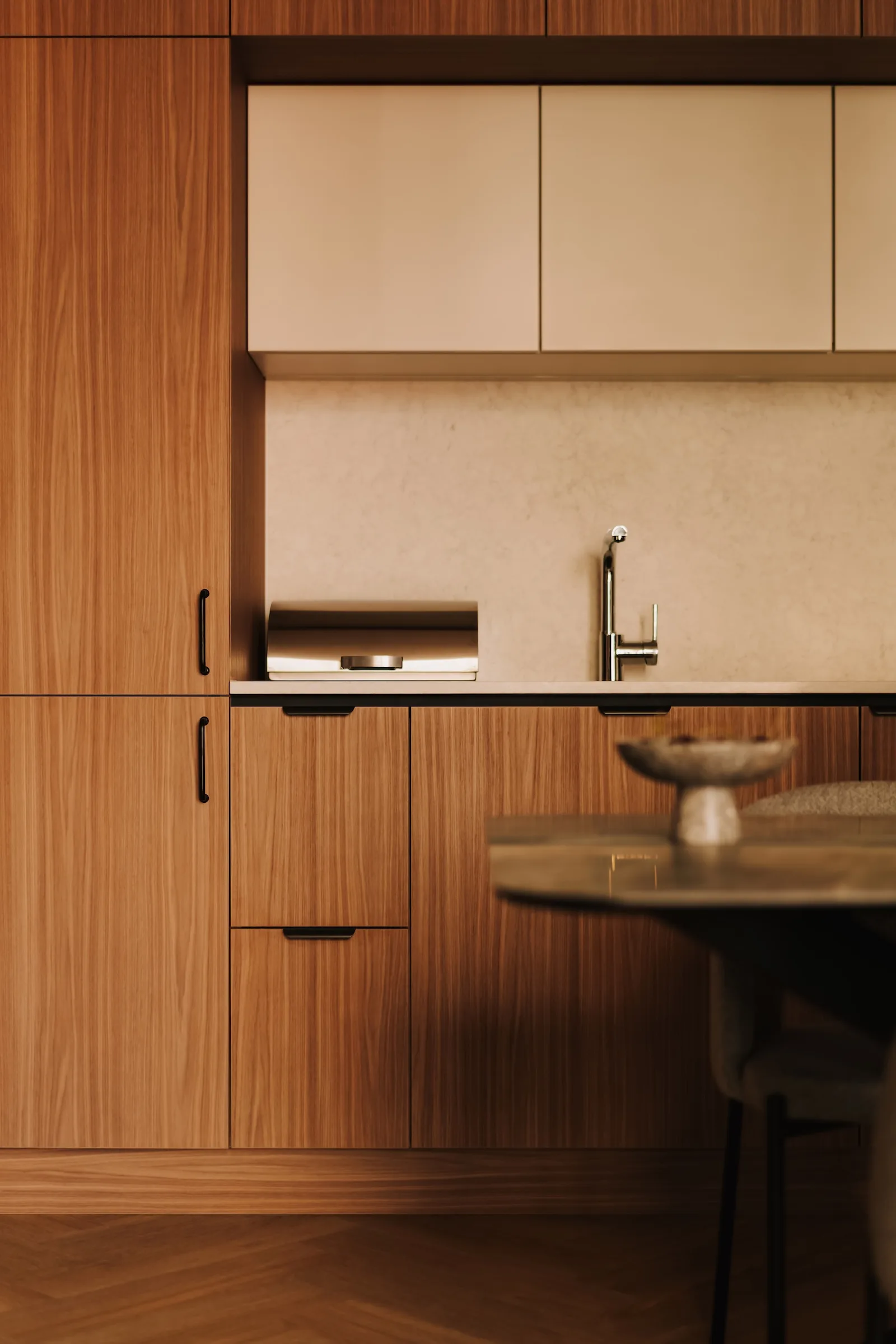Kuchnię wykończono w kolorze orzecha włoskiego, a całość dopełniają fronty górnych szafek w delikatnym beżu i blat z jasnego konglomeratu. Takie połączenie materiałów i kolorów nadaje wnętrzu szlachetności i ponadczasowego charakteru. Podłogi w całym mieszkaniu pokryto panelami winylowymi ułożonymi w klasyczną jodełkę, co dodatkowo podkreśliło inspiracje stylem mid-century modern. Ściany pozostawiono w bieli, która stała się neutralnym tłem dla dekoracyjnych akcentów. Dyskretnie zastosowana sztukateria wprowadza do wnętrza subtelną grę światła i cienia, nadając mieszkaniu wyrazistości, ale bez zbędnej dekoracyjności. W całym apartamencie uwagę zwracają także starannie dobrane detale – od oświetlenia Nordlux, przez meble, aż po osprzęt elektryczny Kontakt-Simon.