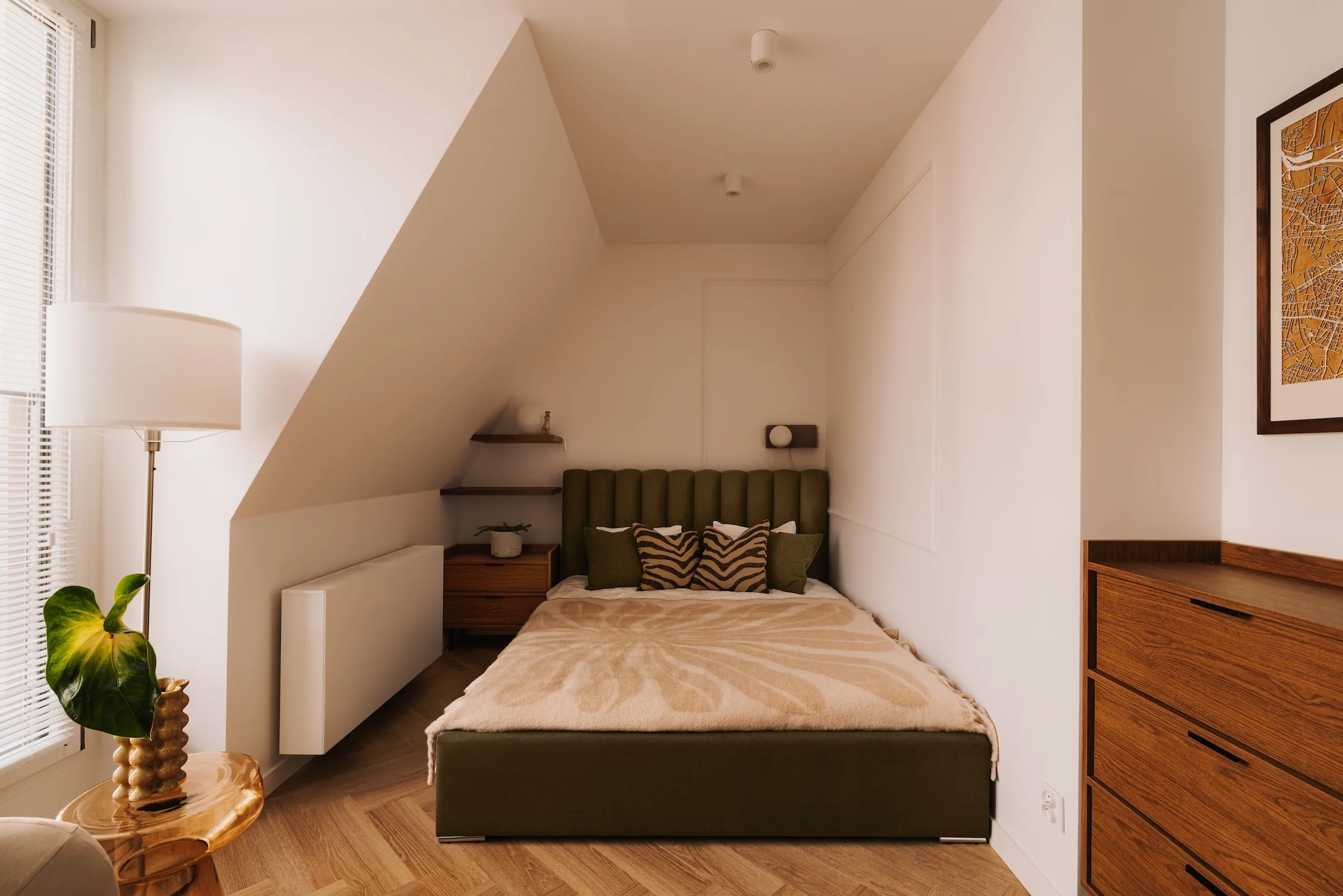 Sypialnia utrzymana jest w spokojnych barwach, z wygodnym tapicerowanym łóżkiem i dodatkami w ciepłej zieleni. Znalazło się tu także wydzielone miejsce do pracy, co podnosi komfort użytkowania mieszkania. W łazience zastosowano jasne płytki, drewniane akcenty i podświetlenie LED, które budują przytulną atmosferę. Zintegrowanie pralni z częścią łazienkową zapewni przyszłym mieszkańcom dodatkową wygodę.