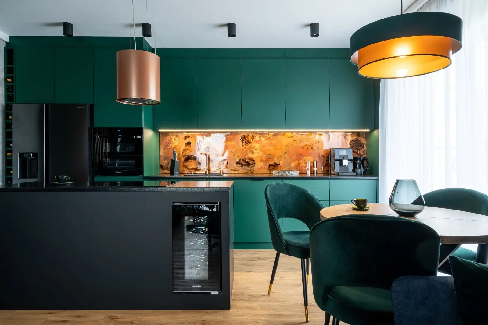 W mieszkaniu dominuje szmaragdowy kolor, który wspaniale kontrastuje z elementami miedzi, elegancką czernią. Połączenie barw jest odważne i nieszablonowe. Kolorystyka projektu nadaje wnętrzu dużo świeżości. Projekt wnętrza opiera się na loftowym stylu w połączeniu z eleganckim wydźwiękiem, gdzie naturalne elementy są przedstawiane w nowej formie. Tak jak np. lakierowana miedź w kołnierzu kuchennym, czy stare rustykalne deski zostały wykorzystane jako drzwi do garderoby czy frontów szafy.