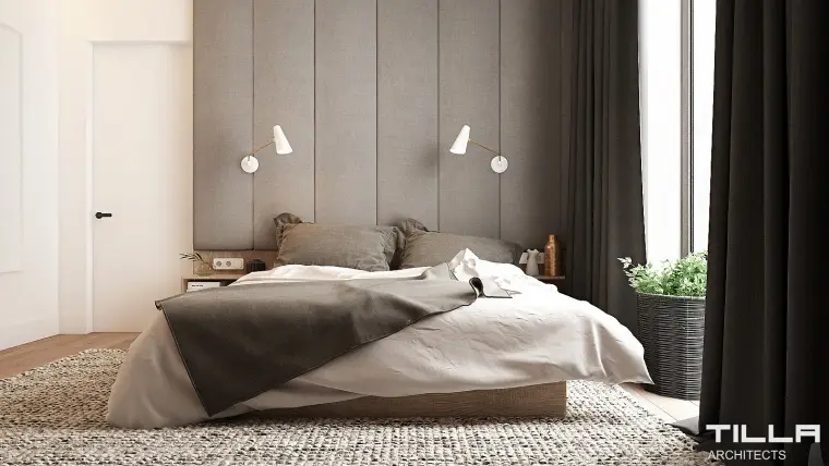 Ukojenie i na spokojny sen może liczyć każdy, w tak urządzonej sypailni. Przyjemne kolory szarości i beże, miękkie i naturalne tkaniany, to idealny przepis na udane wnętrze. Tapicerowana ściana nad łóżkiem to bardzo ciekawy efekt aranżacyjny