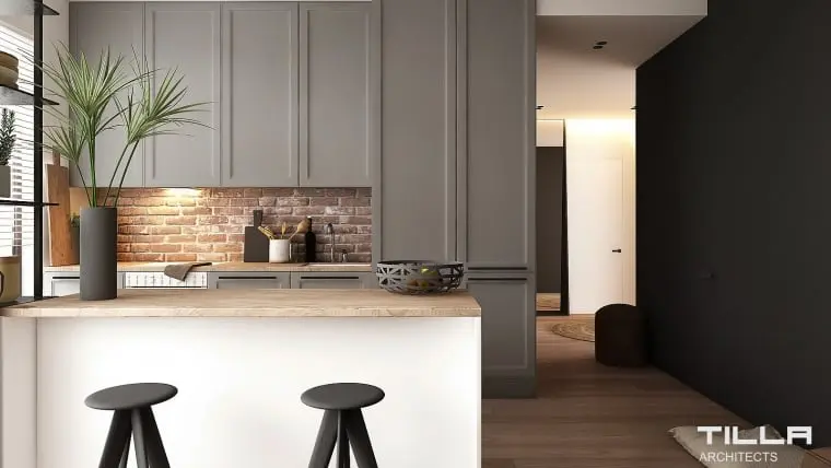 90m2 mieszkanie w nowoczesnym, lekko loftowym stylu. Ceglana ściana w kuchni, jak i w salonie nadaję niebanalnego charakteru. Kuchnia w szarościach z kontrastową, białą wyspą, otwarta na salon, w którym znajduję się wygodna, miękka i rodzinna sofa. Czerwona cegła ciekawie współgra z rudo-brązową sofą i czarnym ozdobnym grzejnikiem.