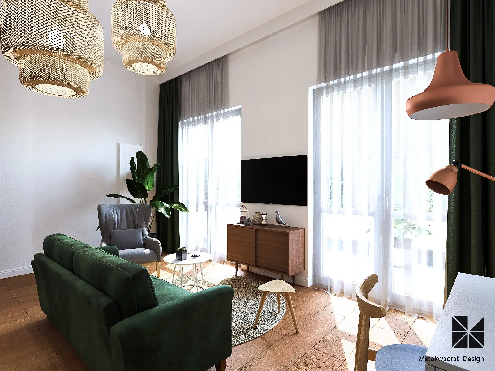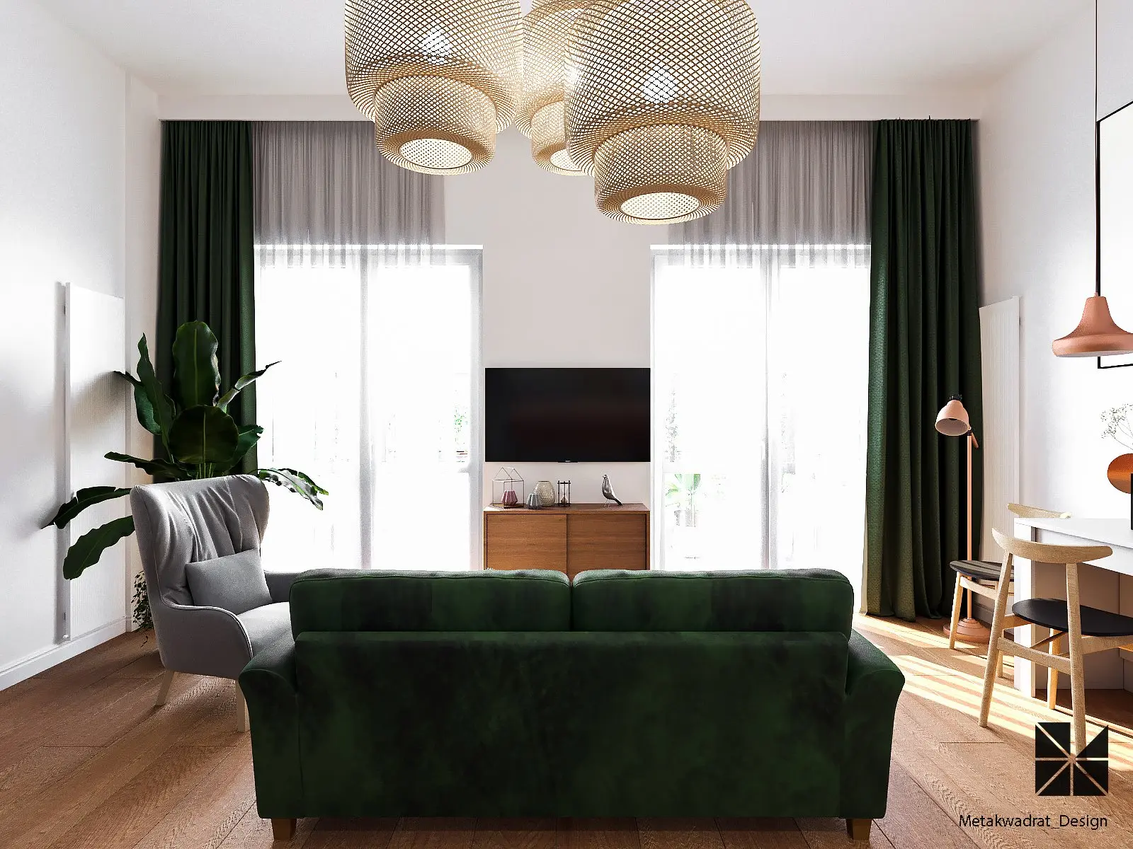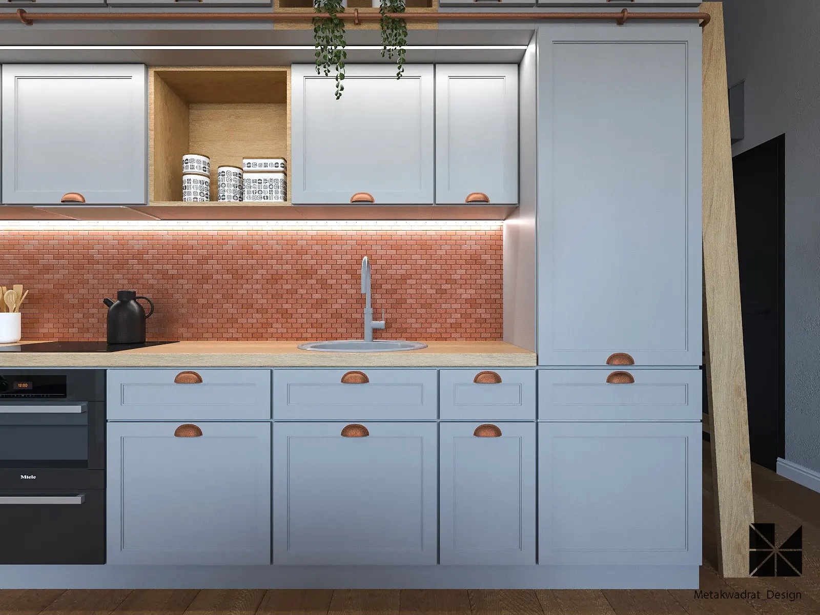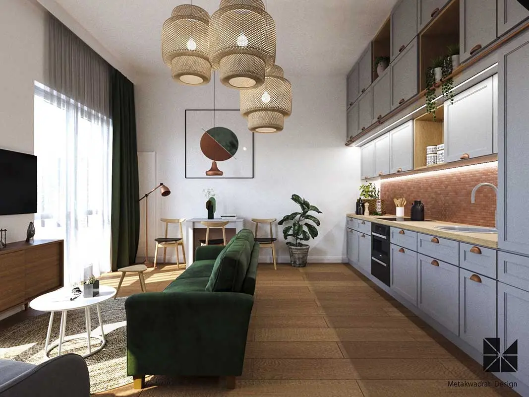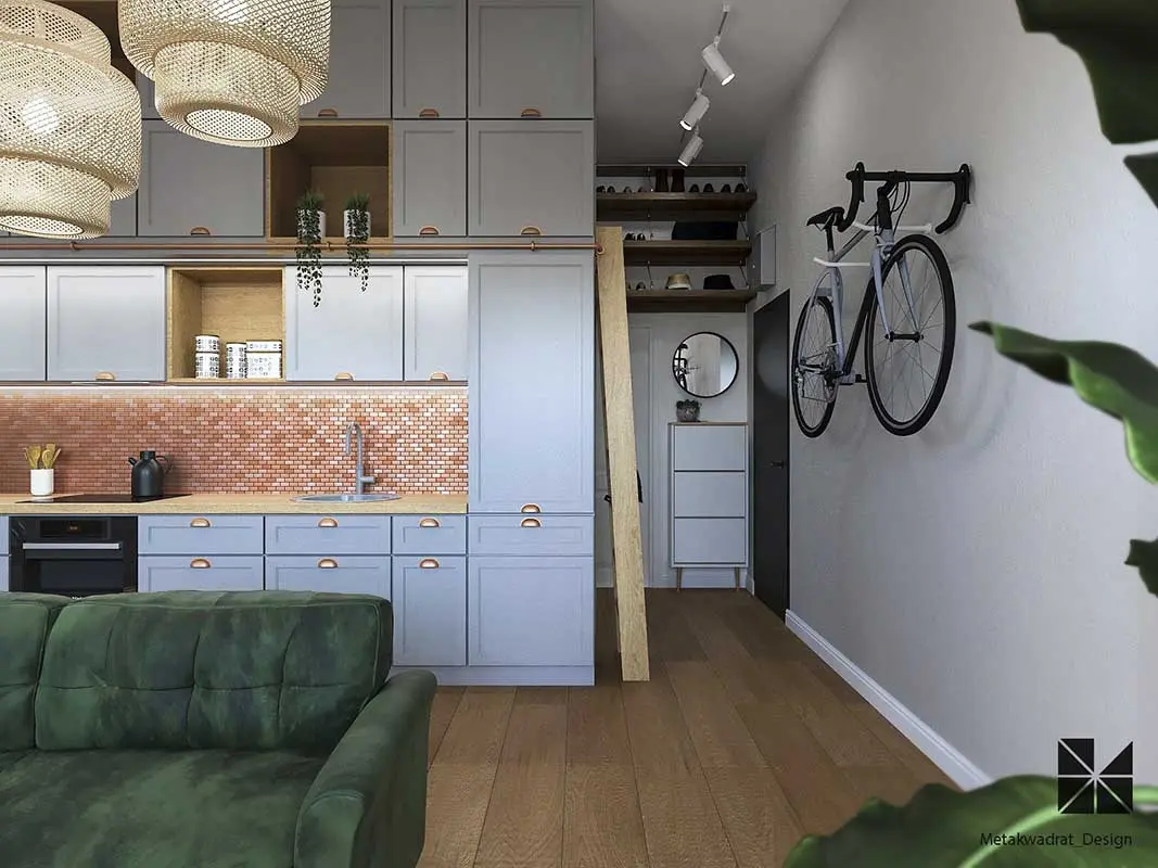 Niesamowite wnętrze, do którego wchodząc odczuwamy samą przyjemność. Materiały użyte do tego projektu miały być jak najbardziej naturalne. Bazą tego projektu jest naturalne drewno, białe ściany i dużo zieleni. Mieszkanie bardzo wysokie 3,29m z funkcjonalnym rozkładem. Wysokie wnętrza dają wiele możliwości aranżacyjnych, dlatego wykorzystano to w 100% przy projektowaniu kuchni. Funkcjonalna z wieloma szafkami do przechowywania, w klasycznej szarości kuchnia. Kuchenna „meblościanka” dała niezwykły efektywny sposób zagospodarowania wolnej przestrzeni.