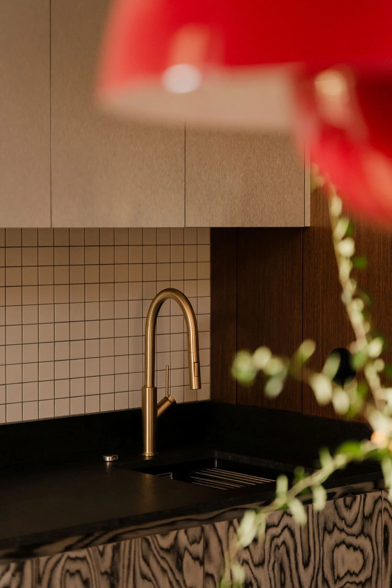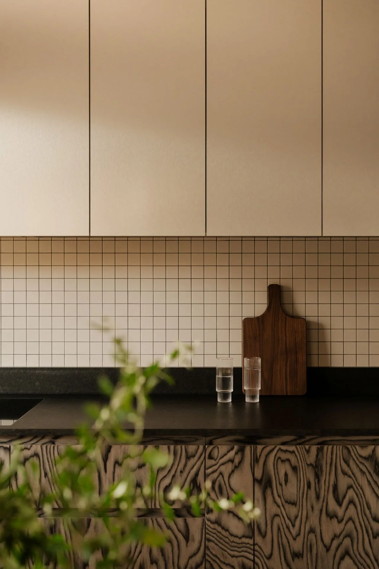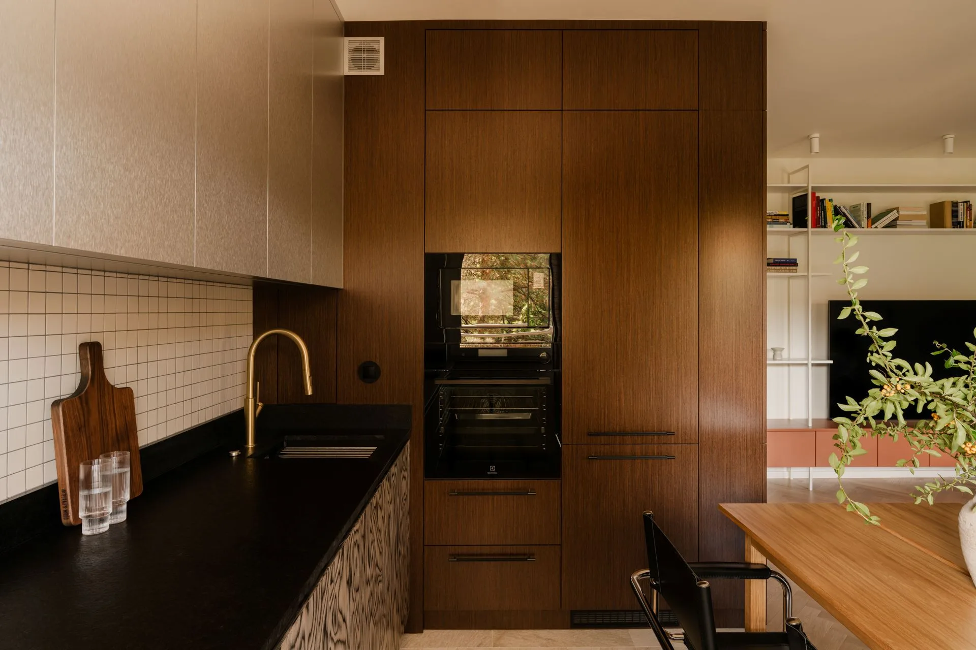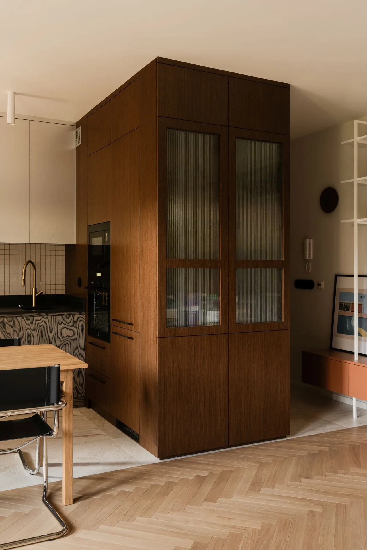 Kuchnia jest jak dobrze skrojona koszula: nie musi błyszczeć, żeby wyglądać świetnie. Fronty w ciepłym drewnie spotykają się z metalicznymi górnymi szafkami, a dolna zabudowa z wyraźnym rysunkiem słojów wprowadza rytm – niemal graficzny, jakby ktoś narysował drewno pewną kreską. To detal, który nadaje charakter bez zbędnej teatralności.