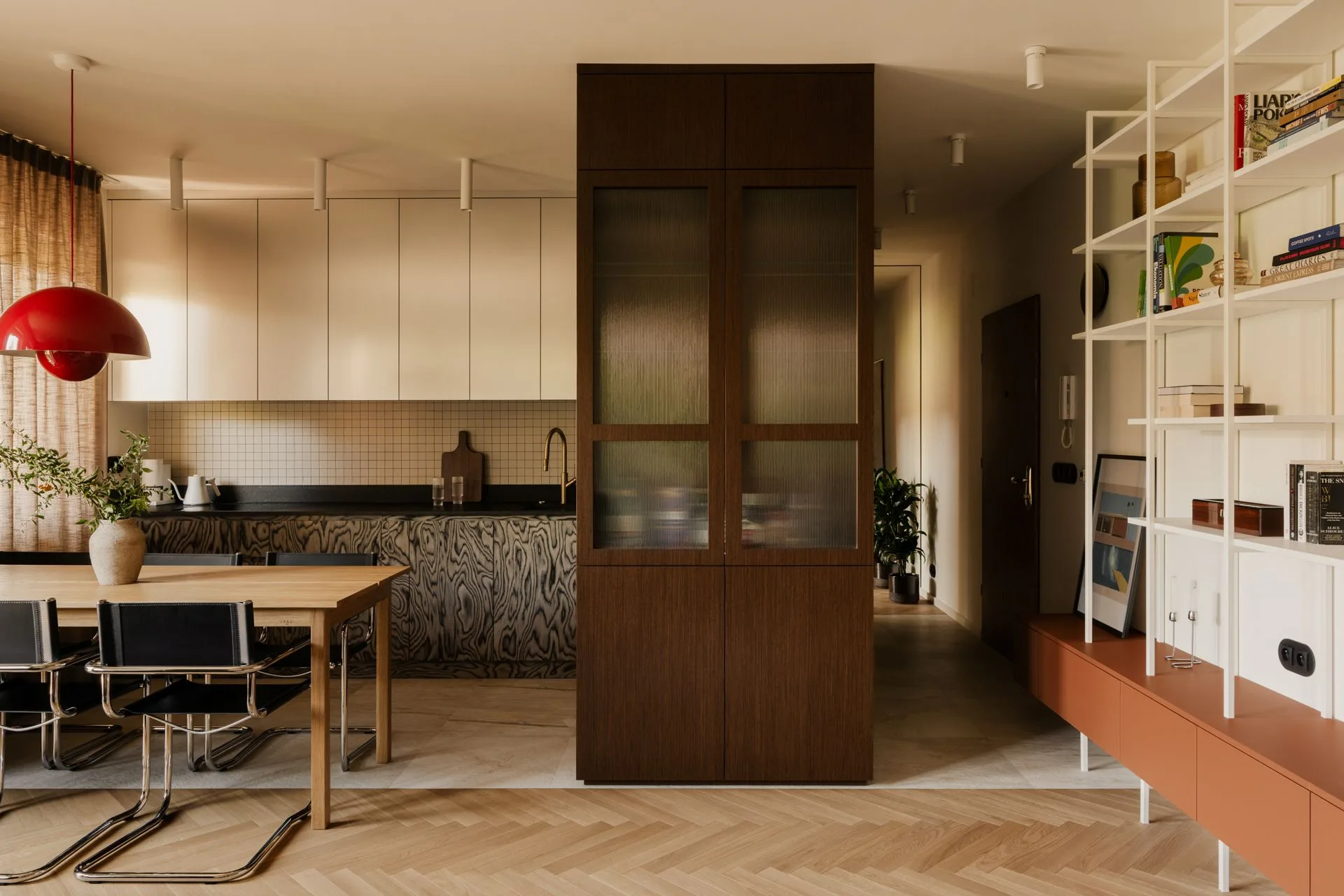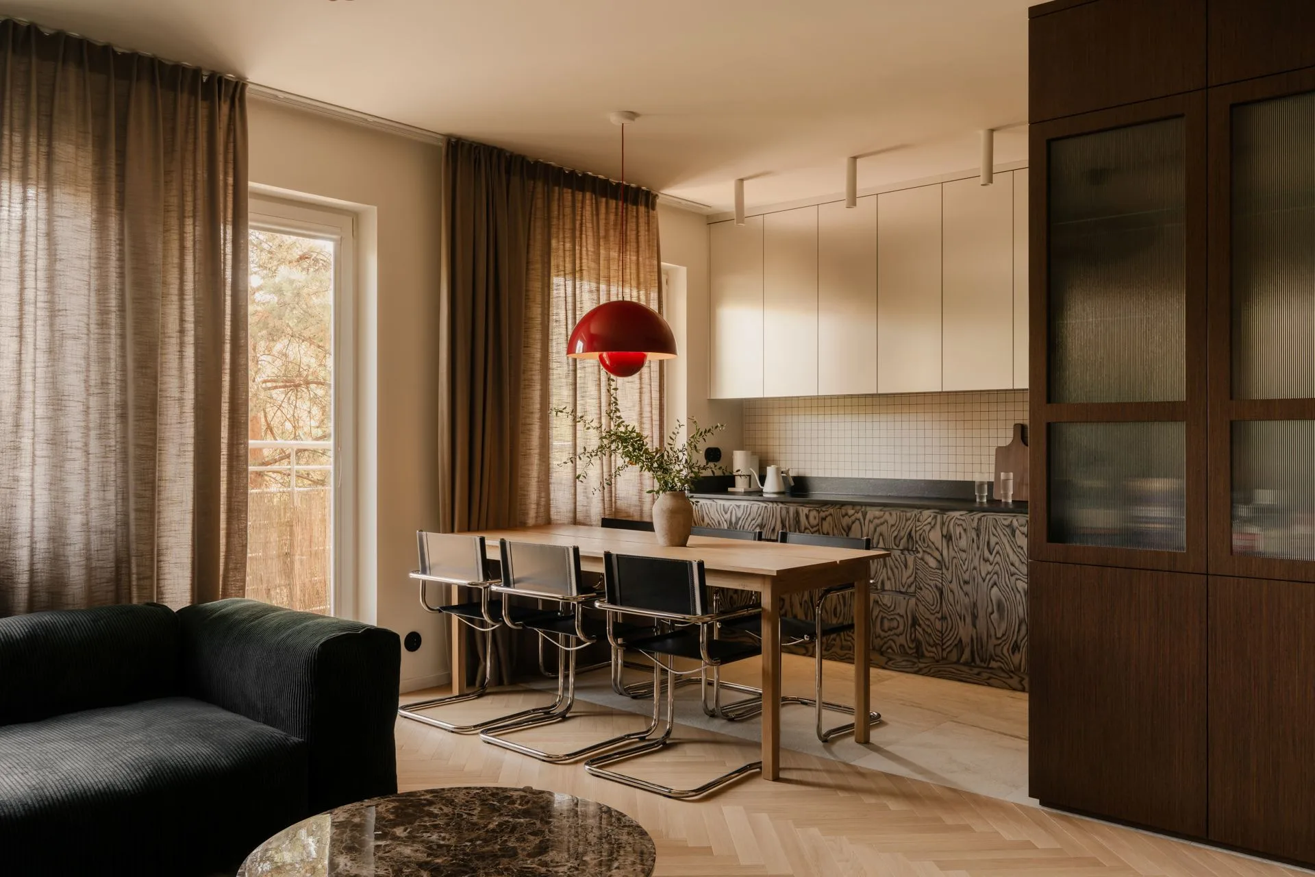 Nad stołem zawisła czerwona lampa Flowerpot – jedyny mocny kolor we wnętrzu. I właśnie dlatego tak dobrze działa. Jak kropka nad „i”, jak szminka w minimalistycznym makijażu, jak gest, który mówi: wiem, co robię. Jej światło ociepla poranki i robi wieczorom kameralność, którą zwykle kojarzymy z małymi bistrami, nie z mieszkaniem w bloku. A tu proszę – można.