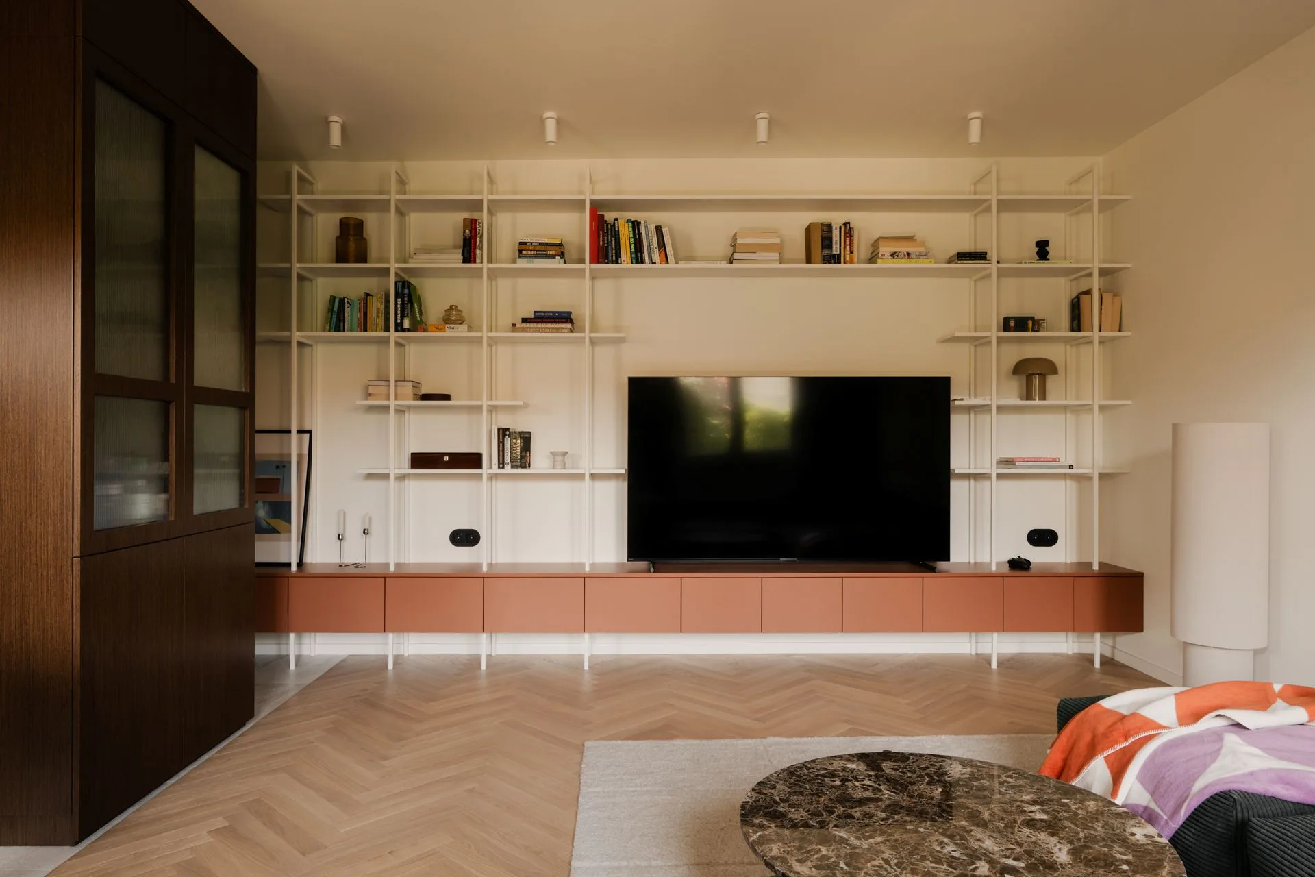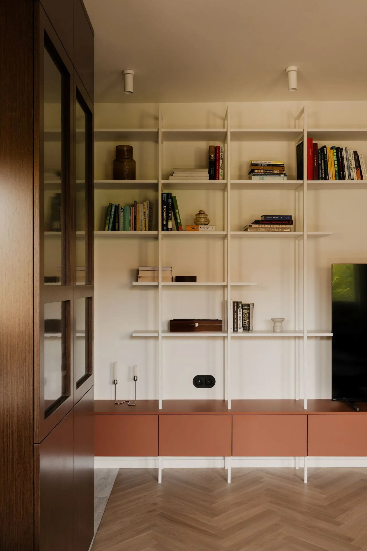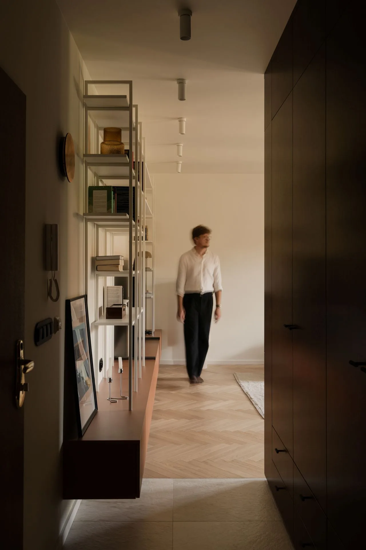 Biblioteczka z otwartymi półkami pozwala na osobiste akcenty: książki, pamiątki, fotografie. Ale niczego nie jest tu za dużo. Każdy przedmiot ma swoje miejsce, jakby mieszkanie miało własną kulturę ciszy – taką, w której nie trzeba niczego zagłuszać.