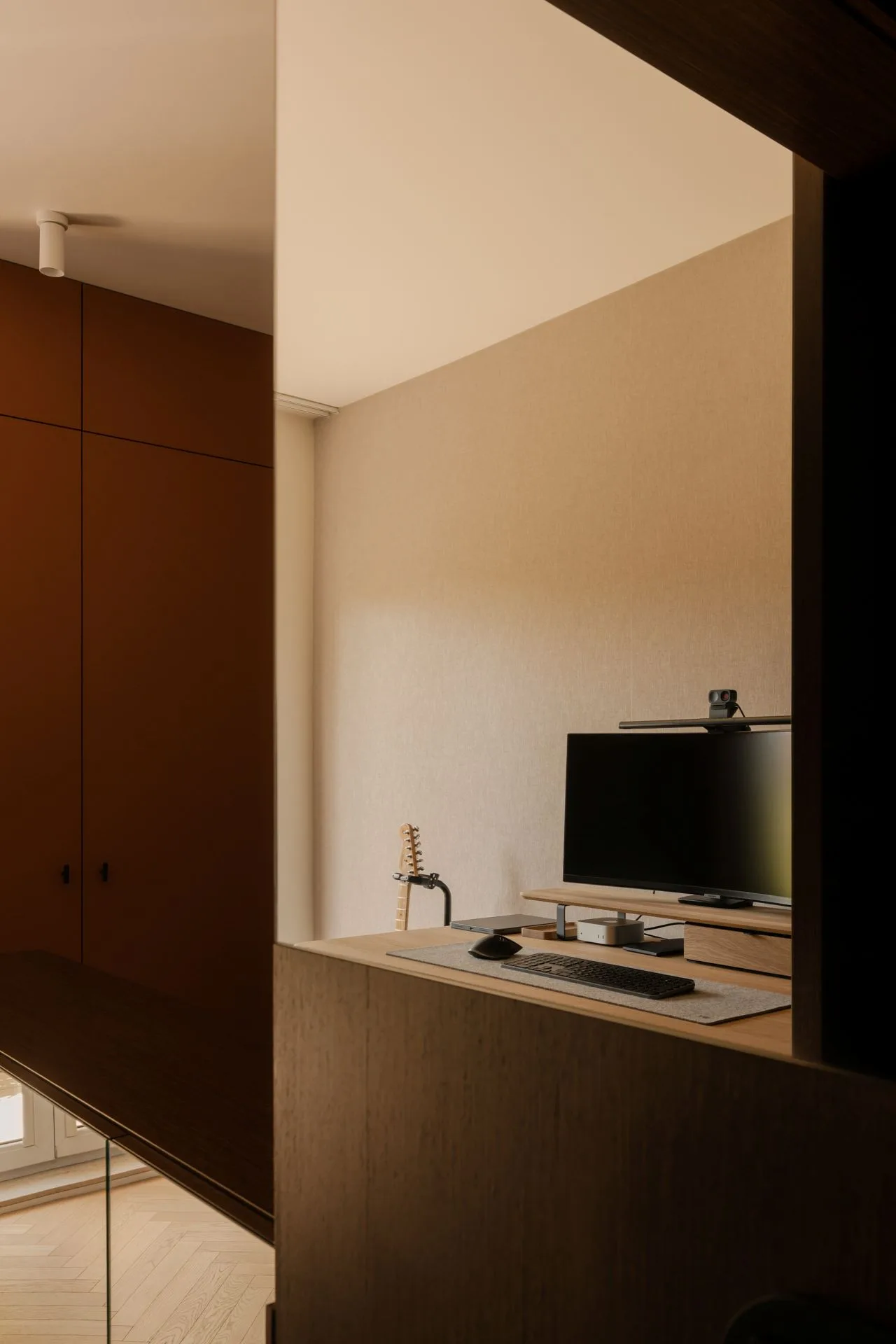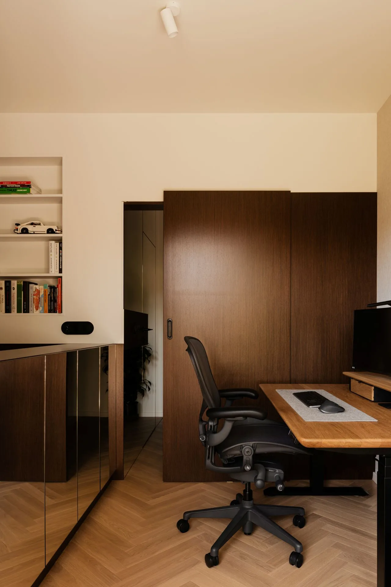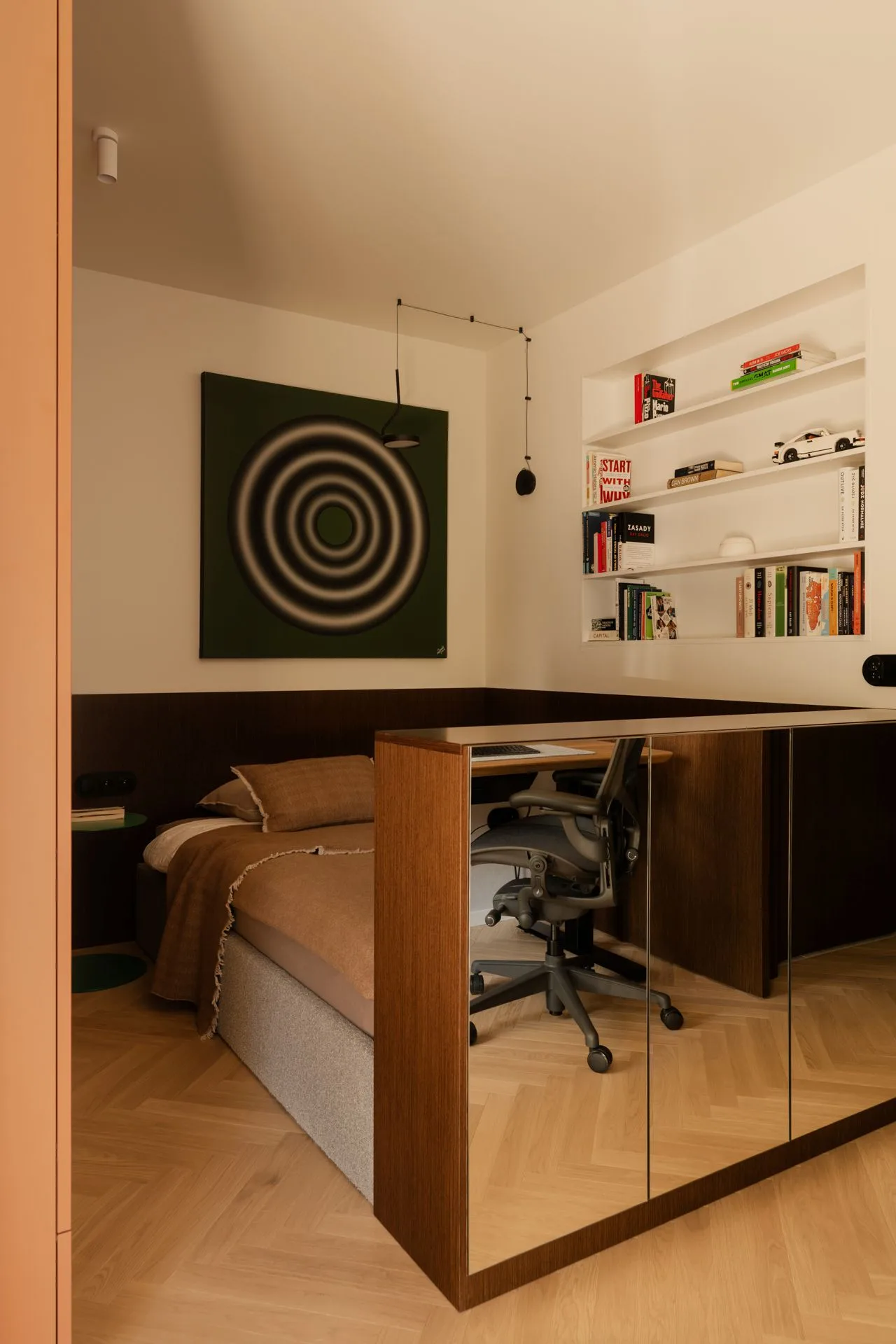 W tej samej przestrzeni znalazło się biurko – dyskretne, funkcjonalne, gotowe na skupienie. Materiały i kolory sprzyjają koncentracji, nie atakują bodźcami. Oddzielenie łóżka od strefy pracy lustrzaną komodą to mądry zabieg: pozwala „przestawić głowę” z trybu zadaniowego w tryb regeneracji. Jak zasłona między dniem a nocą – symboliczna, ale skuteczna.