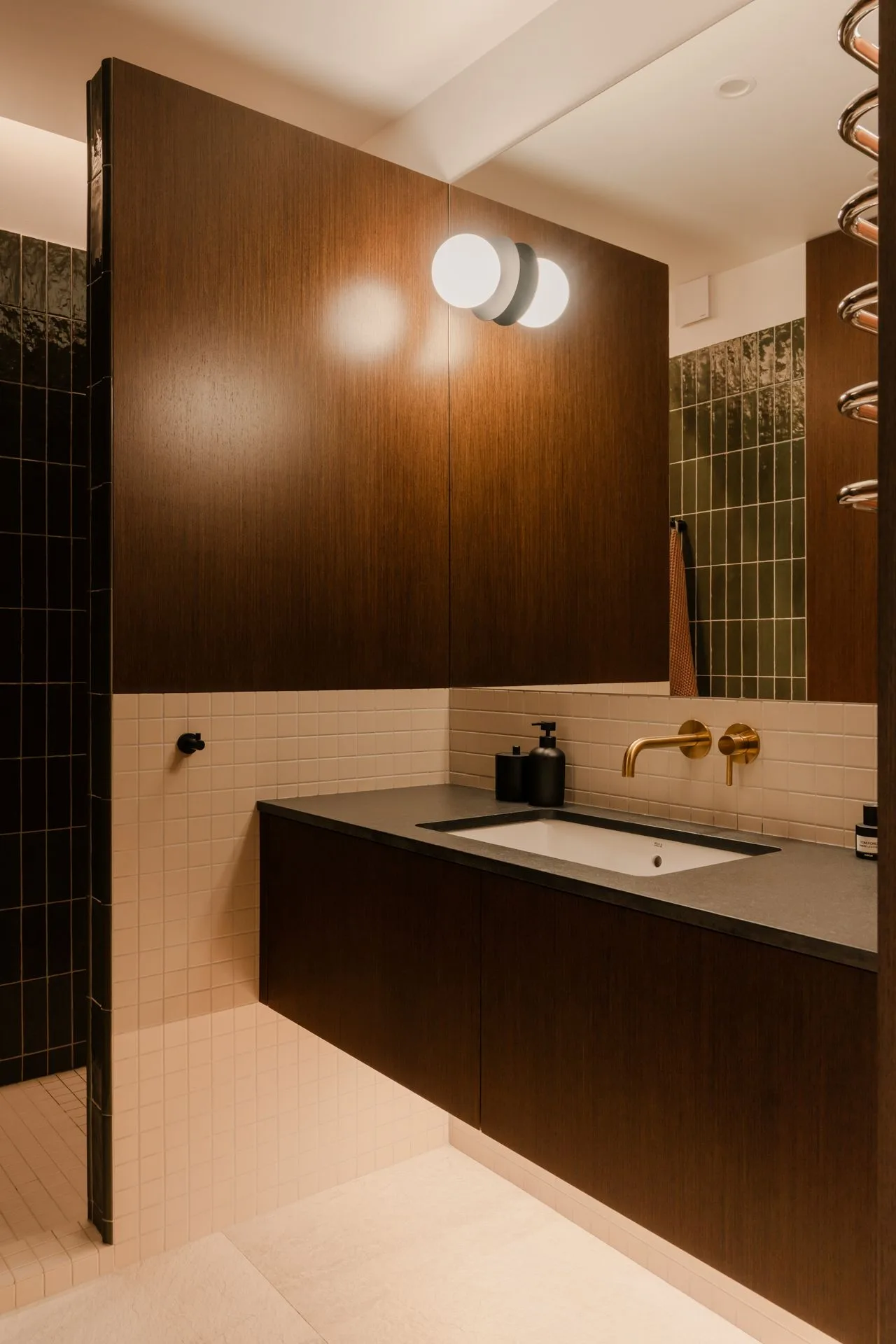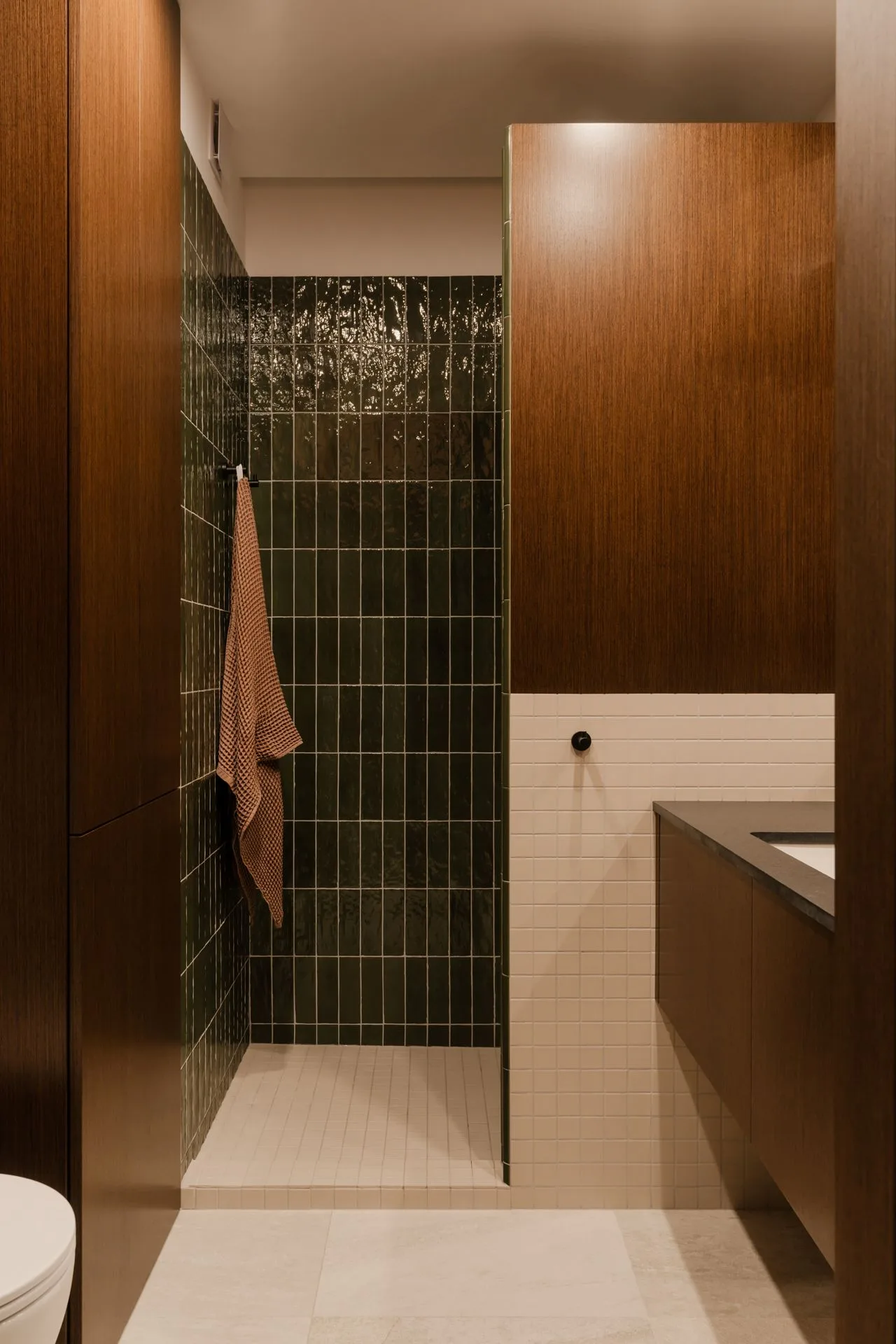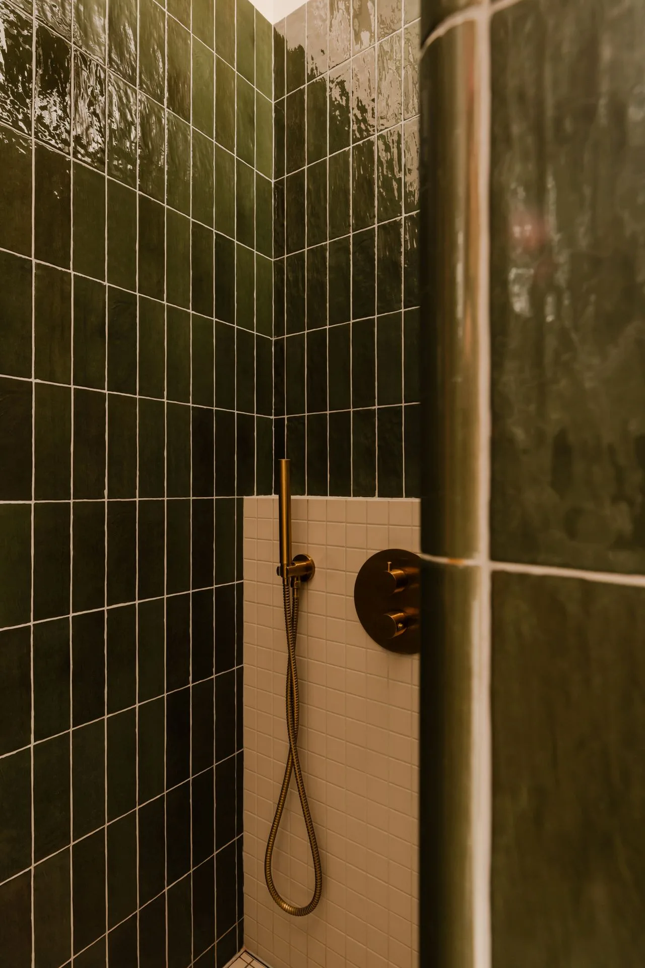 Łazienka jest jak wyciszony kadr z hotelowego spa. W prysznicu pojawiają się płytki w głębokiej, butelkowej zieleni, o nieregularnej powierzchni, która pięknie łapie i odbija światło. W zestawieniu z drewnem i mosiężnymi detalami całość robi się intymna, ciepła, niemal zmysłowa – bez przesady, raczej jak ulubiony zapach, który zostaje na skórze dłużej niż sam prysznic.