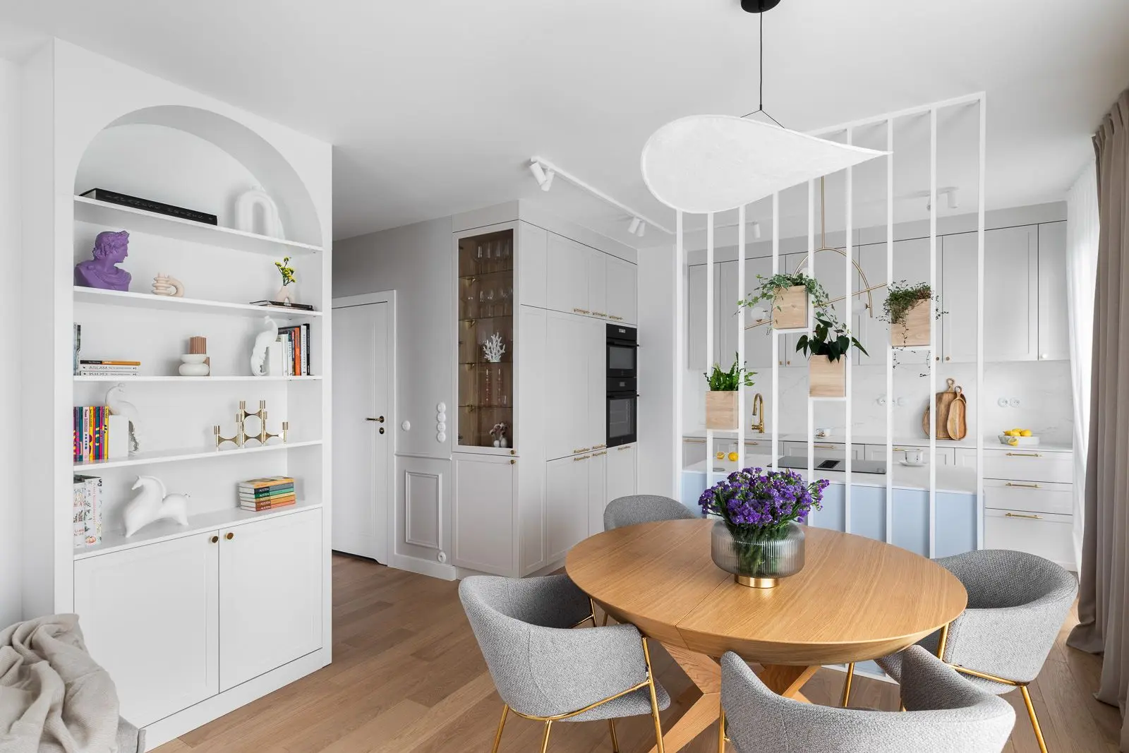 Jednym z najważniejszych i najbardziej charakterystycznych elementów aranżacji jest ścianka ażurowa, która subtelnie wydziela przestrzeń kuchni od strefy dziennej. Wykonana z profili stalowych malowanych proszkowo na biało, z osłonkami na donice z płyty laminowanej, stanowiła nie tylko funkcjonalne, ale i estetyczne rozwiązanie. Ścianka ta skupiła na sobie uwagę, stając się sercem kuchennej strefy.