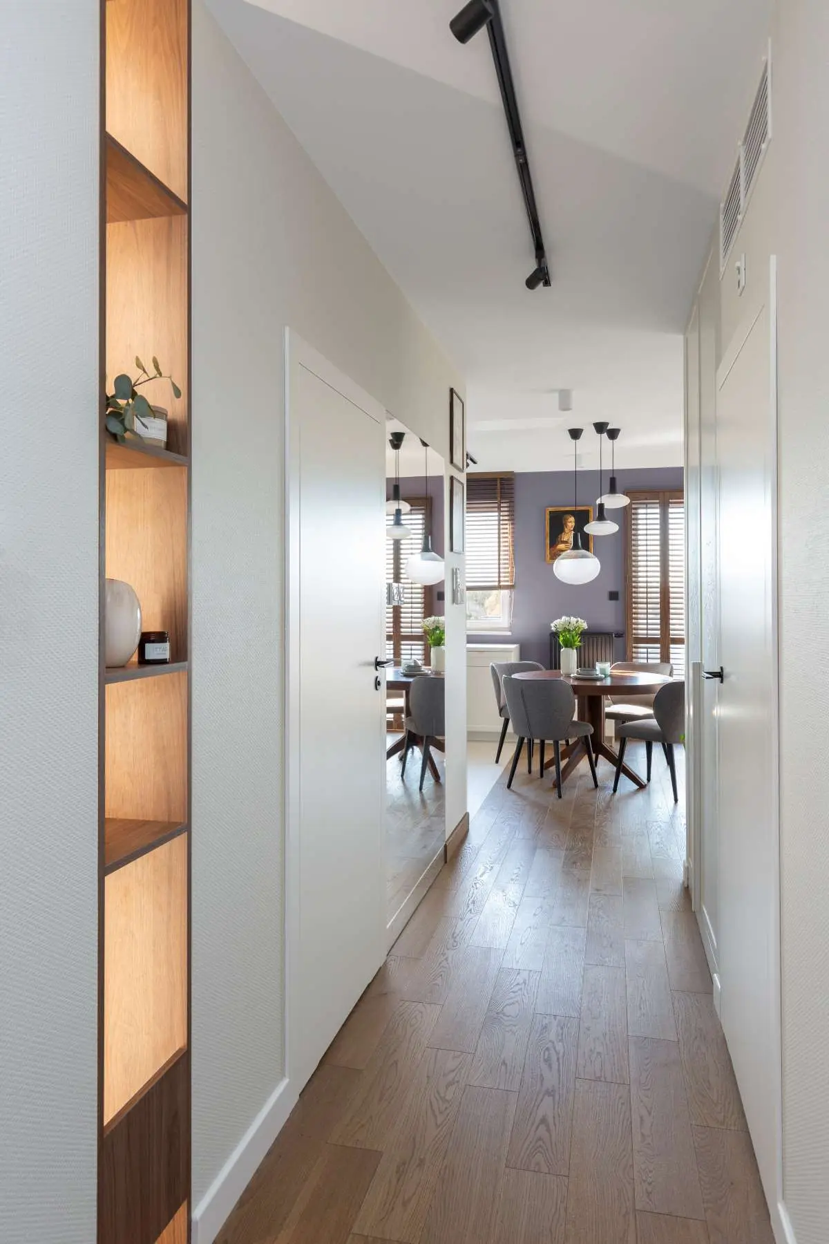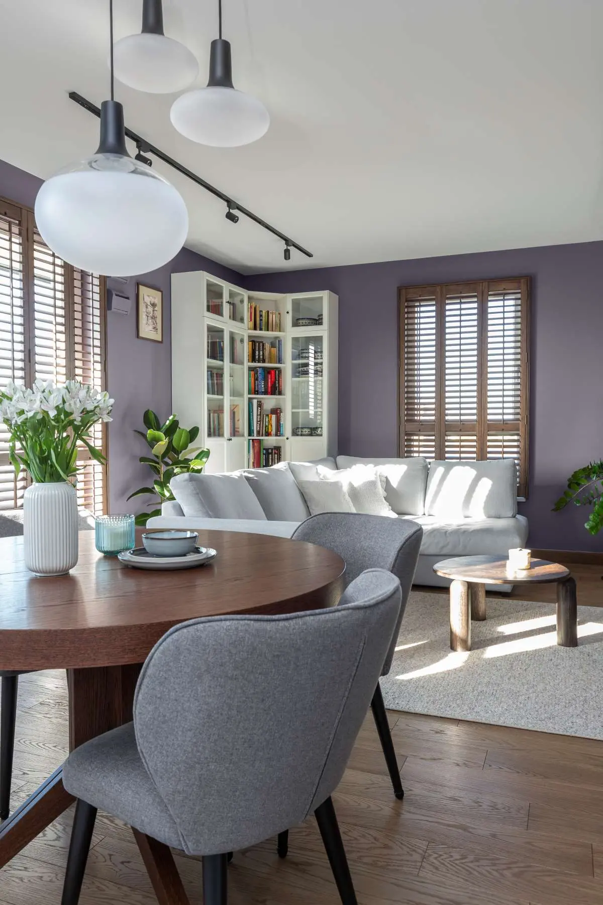 Góry stały się inspiracją do stworzenia wyjątkowego projektu mieszkania. Ważna była tu również kolorystyka. Nie przypadkowo architekta użyła na ściany fiolet szafranu inaczej zwanego krokusem. Biel śniegu szczytów górskich, błękit nieba widoczny w tkaninie na sofie w salonie. Lustra odbijają słońce jak górskie potoki, wełniane dywany i kamienne płytki oddające hołd przepięknie rzeźbionym przez naturę skałom. Zastosowane w oknach drewnianych żaluzji regulują nasłonecznieniem mieszkania. To gra światła i cienia prawie tak bajeczna jak górskie zachody słońca.