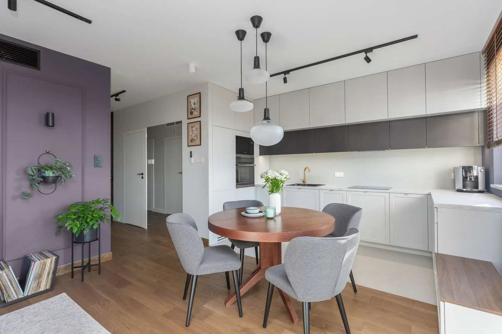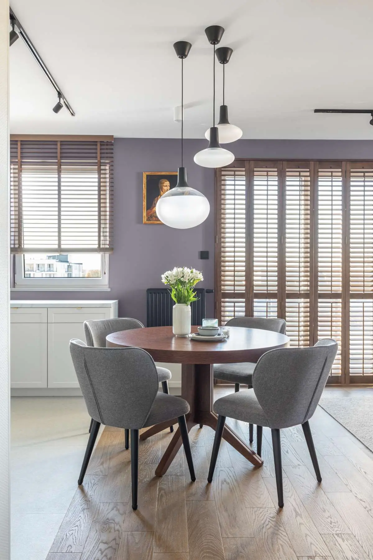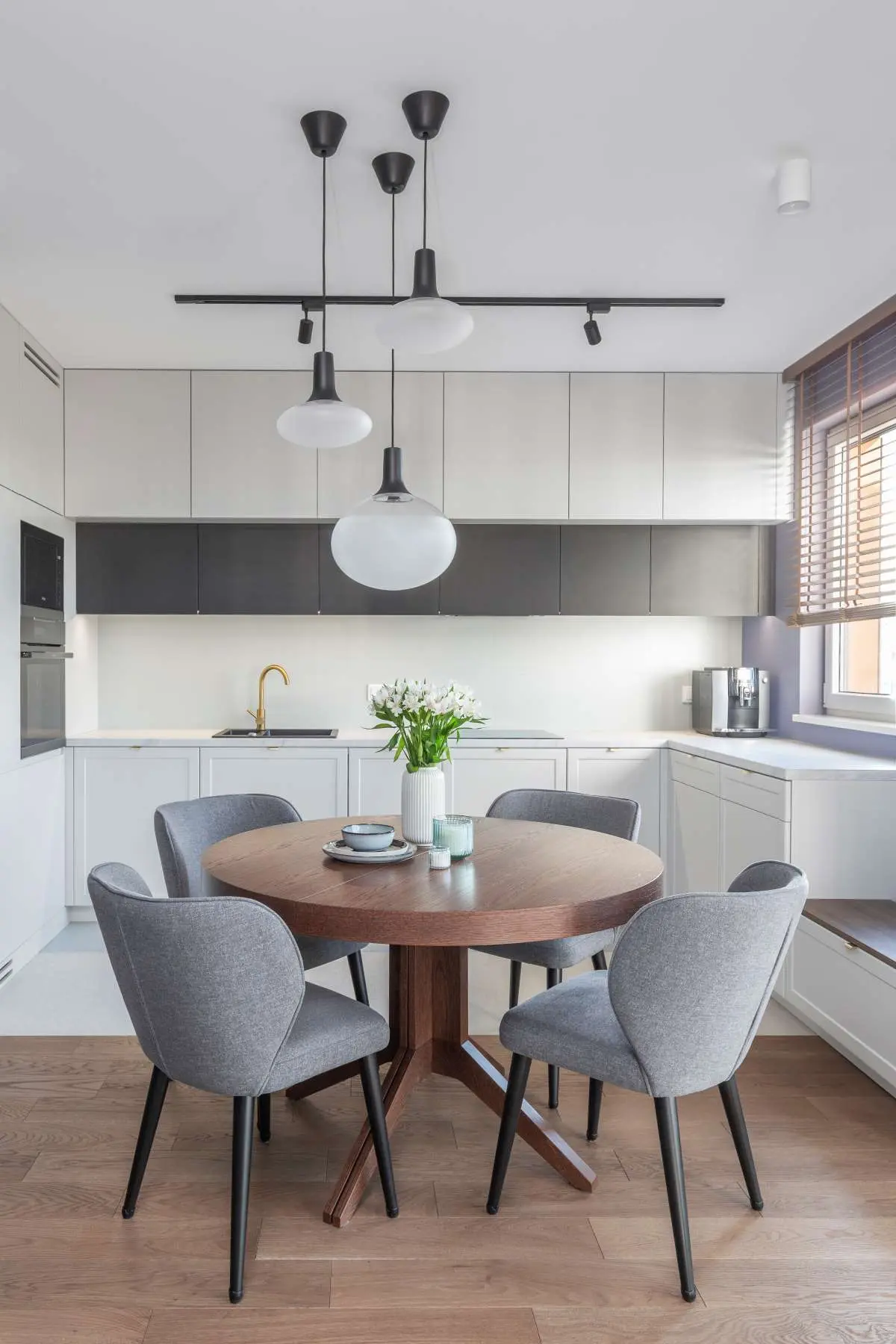 Niewielka jadalnia z okrągłym drewnianym stolikiem i czterema krzesłami tapicerowanymi oddziela w subtelny sposób kuchnię od salonu. Stolik został oświetlony zwieszanymi lampami.