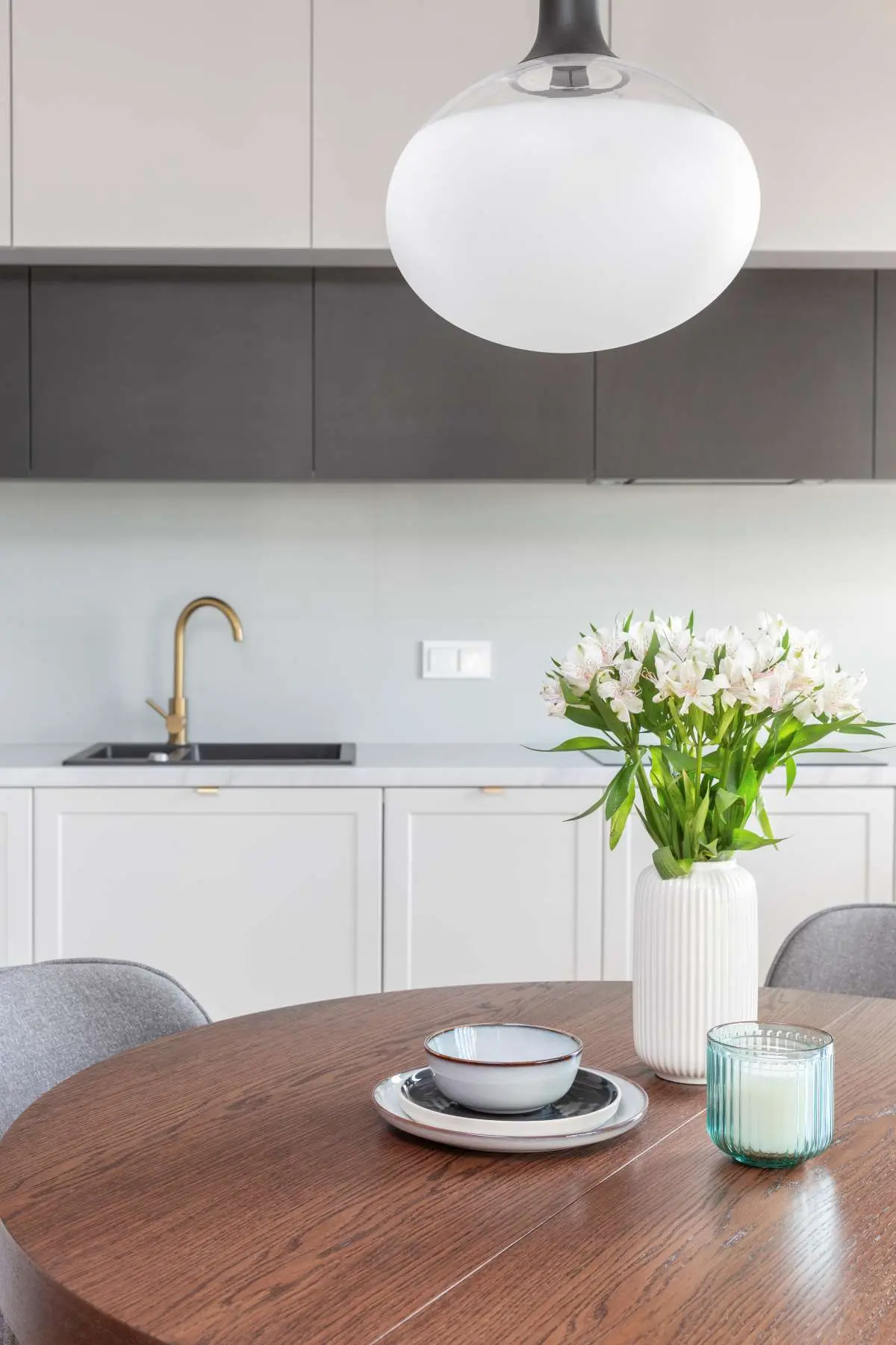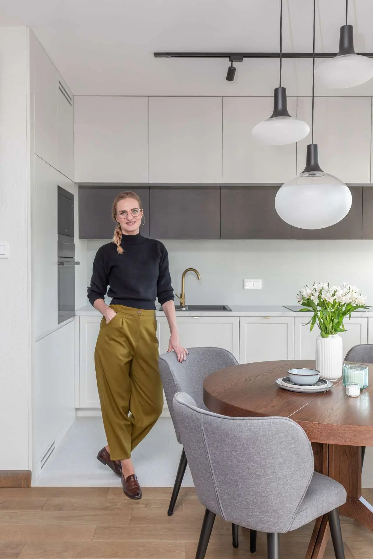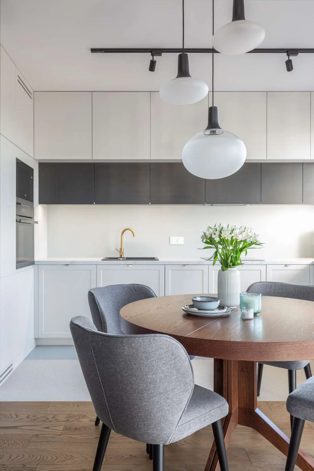 Niewielka jadalnia z okrągłym drewnianym stolikiem i czterema krzesłami tapicerowanymi oddziela w subtelny sposób kuchnię od salonu. Stolik został oświetlony zwieszanymi lampami.
