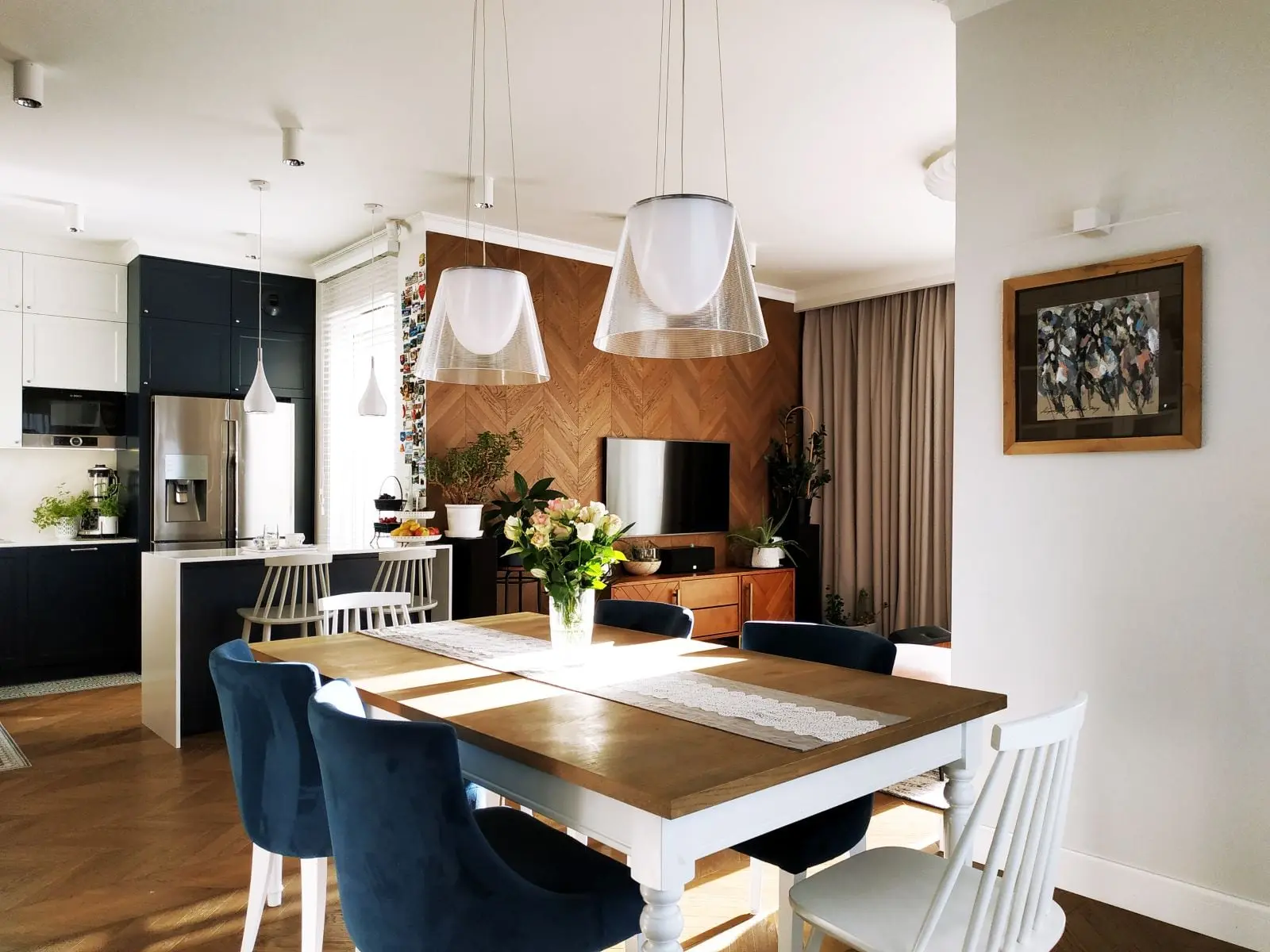 Kuchnia, utrzymana w kolorach bieli i granatu, połączona została z salonem, tworząc harmonijną całość. Drewniany stół w jadalni, podkreślony lampami FLOS, razem z witrynową zabudową, nadają wnętrzu przytulny charakter. Aby złamać jednolitą kolorystykę, dość odważnie postawiono na jasnoróżową sofę, świetnie kontrastującą z granatowym fotelem Charlesa Eamsa.