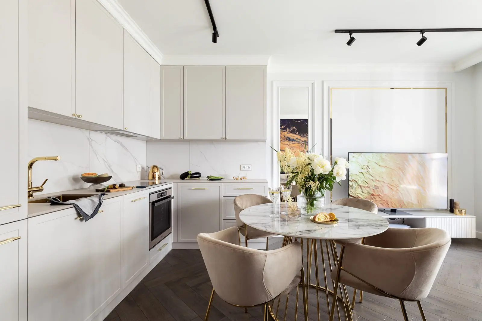 Złote dodatki, występujące we wszystkich pomieszczeniach, dopełniają dekoracyjny efekt wnętrza. W zestawieniu ze wzorem marmuru, podłogą w jodłę klasyczną czy też stonowaną paletą barw, stanowią niezwykle stylowe i eleganckie połączenie. Równie ważnym elementem, pojawiającym się we wszystkich pomieszczeniach, są sztukaterie. Listwy ścienne i sufitowe tworzą efektowną oprawę wnętrza, co nadaje mu niepowtarzalnego charakteru. Dla jeszcze większego podkreślenia tego efektu, w salonie oraz sypialni zastosowane zostały złote listwy, wpisane w geometrię sztukaterii. Dekoracyjna sztukateria ścienna została wykorzystana również jako rama dla luster, które odbijając światło rozświetlają i powiększają optycznie przestrzeń.