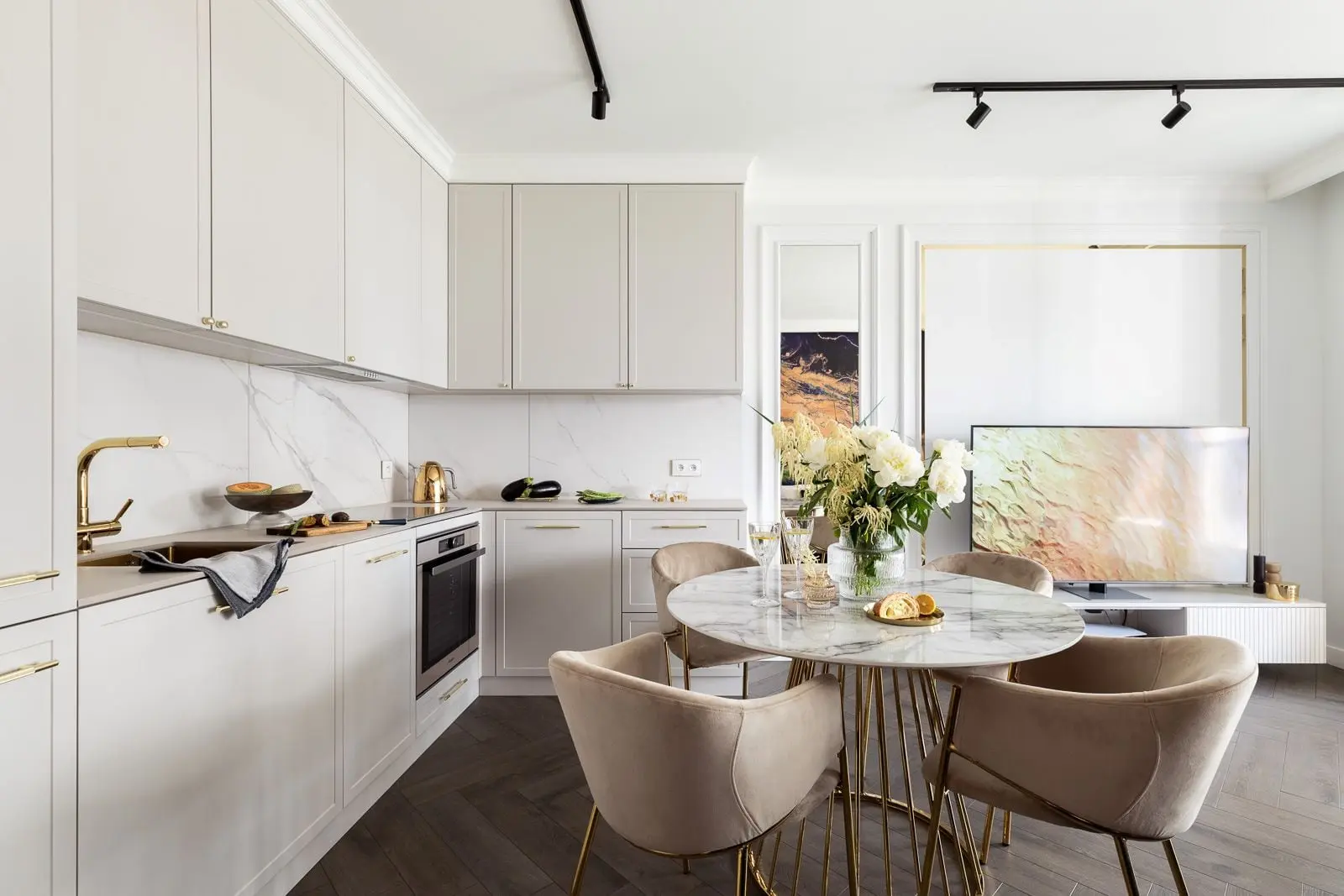 Tuż po przekroczeniu progu mieszkania, roztacza się widok na elegancką strefę dzienną. Ciekawy, a nawet zaskakujący efekt daje lustro w ramie ze sztukaterii, w którym odbija się dekoracyjna tapeta. Takie połączenie tworzy iluzję przejścia do kolejnego, tajemniczego pomieszczenia. Wyjątkowy wzór tapety w odcieniach złota i granatu kontrastuje z jasnym kolorem ścian oraz mebli w salonie. Zabudowa kuchenna w stonowanym beżu, delikatnie wtapia się w przestrzeń salonu, będąc jego spójną częścią. Właścicielom mieszkania zależało na tym, aby kuchnia nie miała mocno roboczego charakteru, a największym marzeniem jeśli chodzi o jej wyposażenie był zlewozmywak w kolorze złota. Strefa dzienna miała być głównie miejscem spotkań i relaksu po intensywnym dniu pracy mieszkańców.