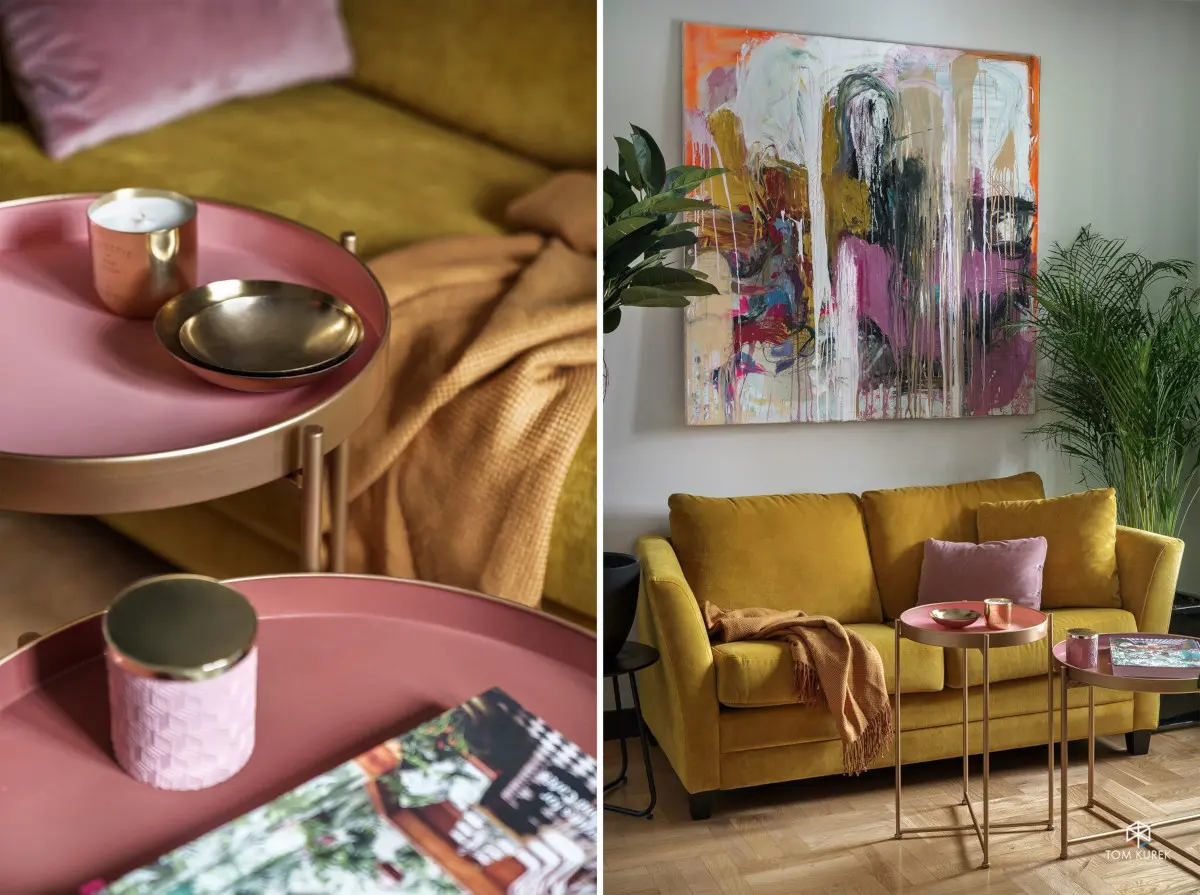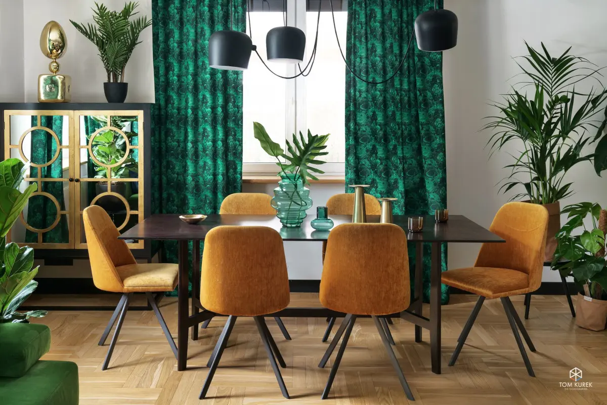 Właścicielka mieszkania jest osobą bardzo barwną, co doskonale obrazuje ten projekt. Miejscem, które skupia na sobie spojrzenia wszystkich miłośników dobrego wzornictwa jest salon, w którym króluje nieoczywiste połączenie szmaragdu i błękitu. Jeszcze bardziej nonszalancki charakter wnętrze zyskało za sprawą musztardowych akcentów.