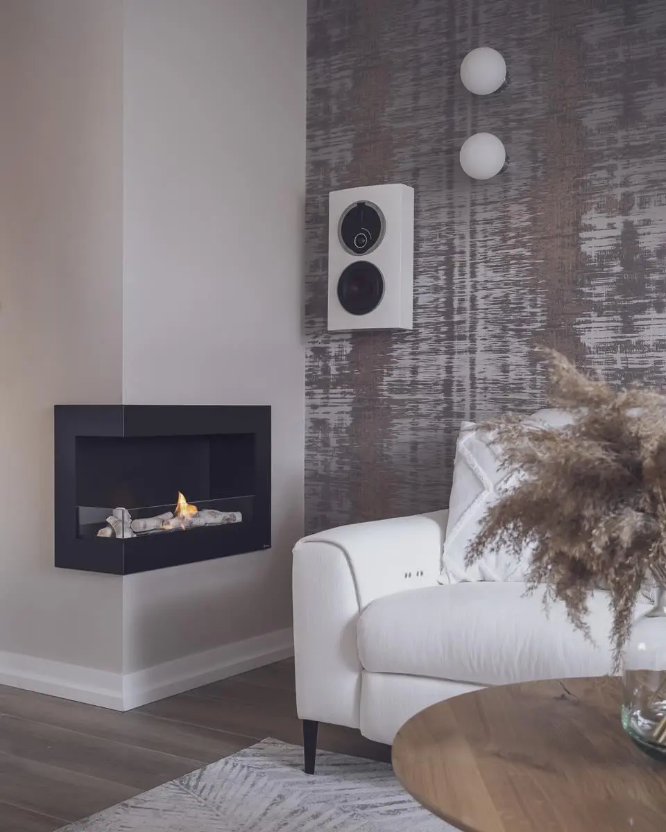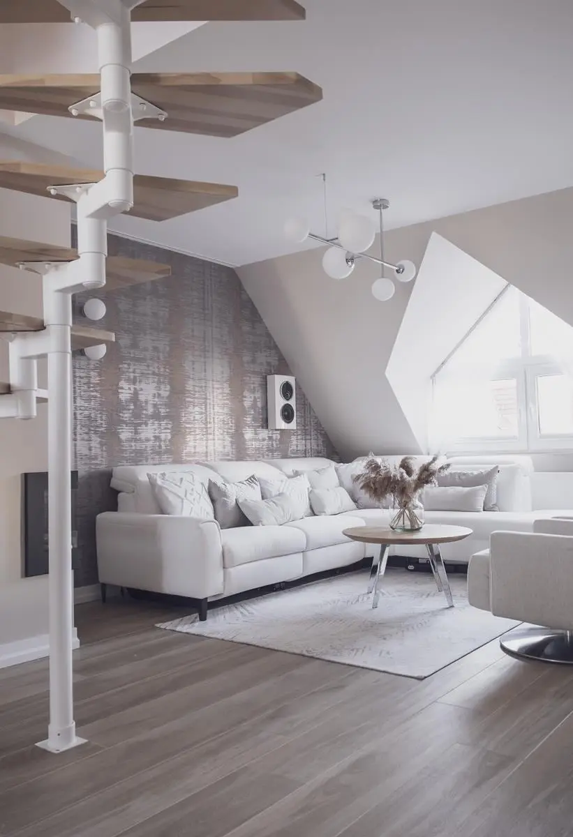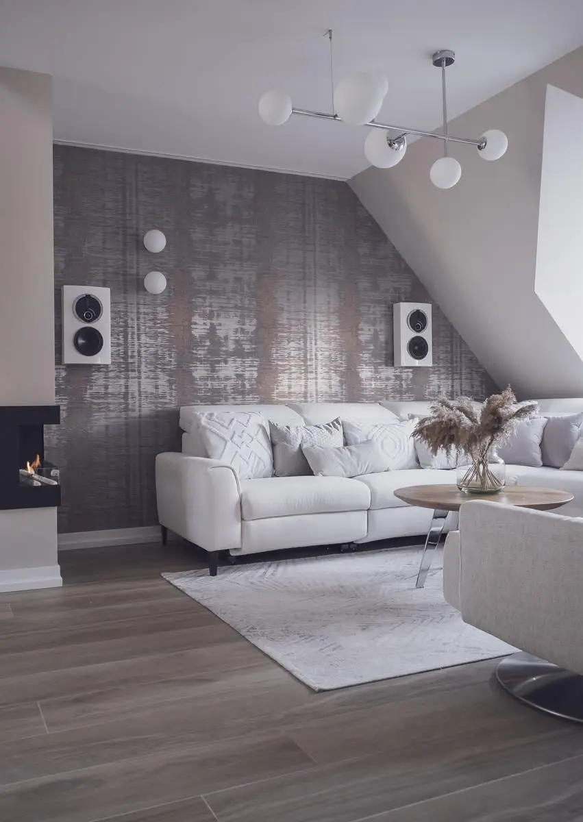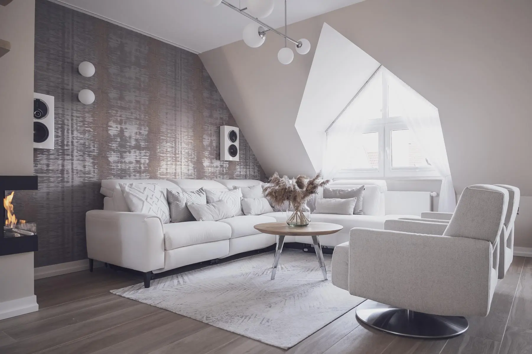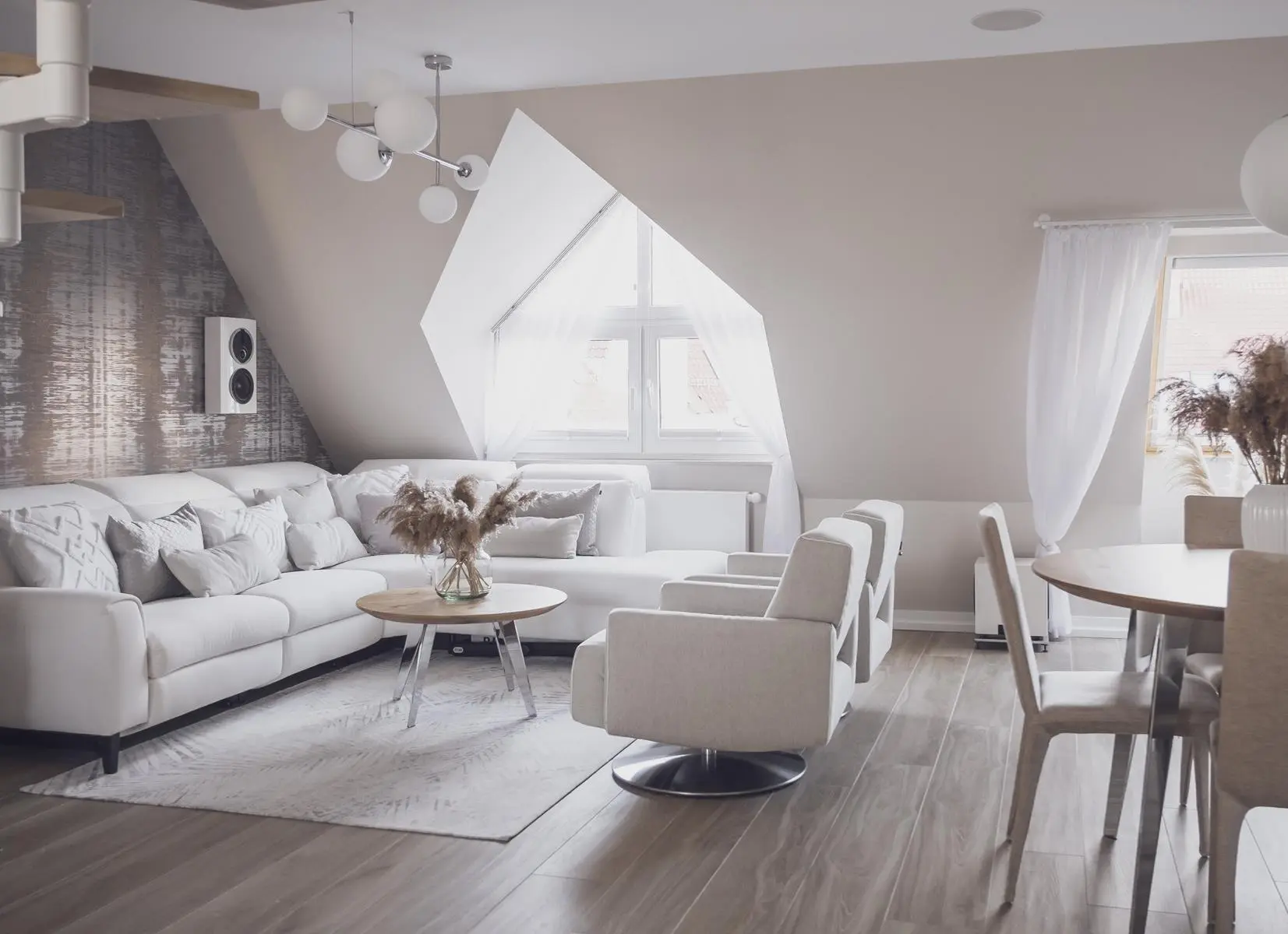 Funkcjonalność mieszkania na poddaszu jest widoczna również w elementach wyposażenia. Narożnik w salonie to nie tylko miejsce do siedzenia, ale również do relaksu. Obrotowe fotele pozwalają zażegnać problem przestawiania mebli wtedy, kiedy właściciele przyjmują gości. Całe mieszkanie ma system sterowania smart, dzięki któremu można głosowo włączyć ulubioną muzykę, czy zwiększyć bądź zmniejszyć natężenie światła.