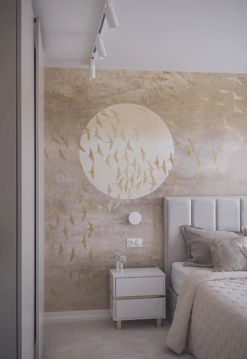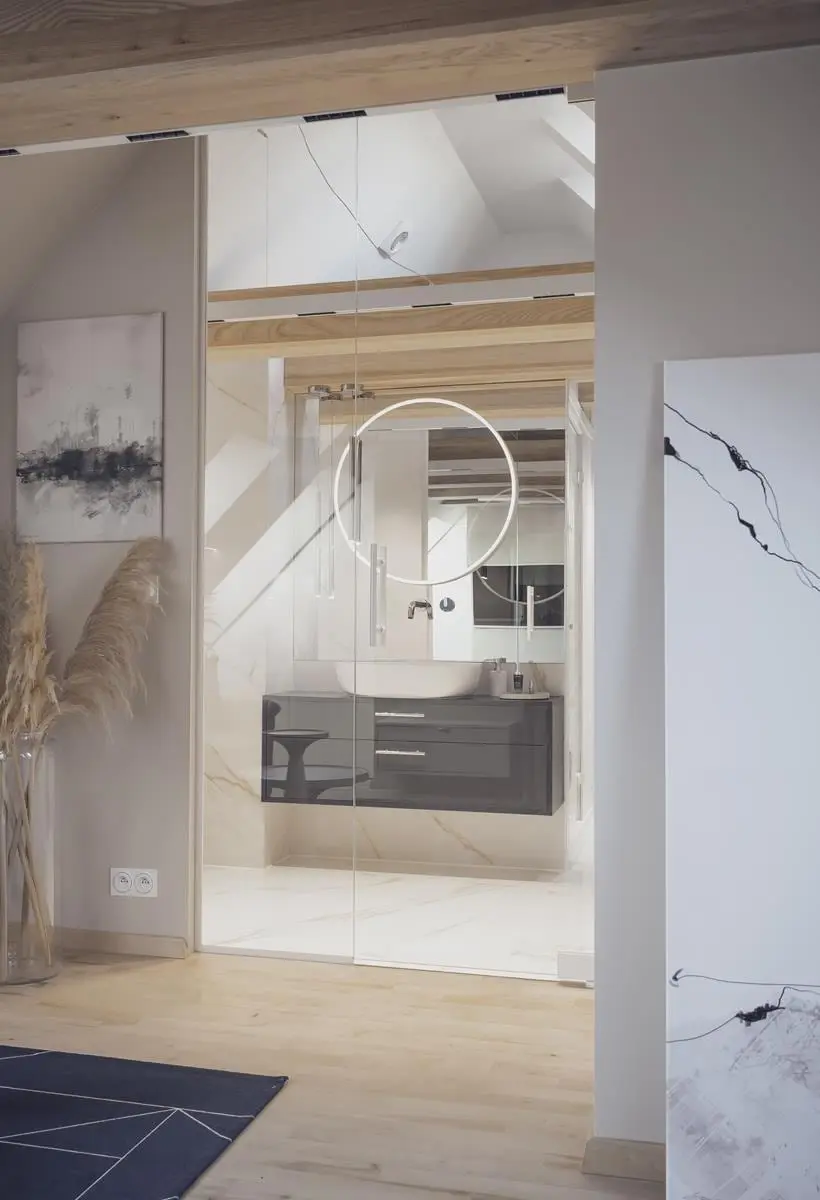 Jak podkreśla architektka, kluczową kwestią było „wyprostowanie” wnętrza. Właśnie dlatego w projekcie dominują jasne kolory, takie jak biel czy beż, a także tapety ze wzorem, który sprawiają, że pomieszczenia wydają się wyższe. Optyczne podniesienie wnętrza było możliwe również dzięki pionowej zabudowie meblowej. Istotne było również otwarcie przestrzeni, za które odpowiada nie tylko połączenie salonu z kuchnią, ale również przeszklenie ściany pomiędzy łazienką a pokojem na poddaszu.