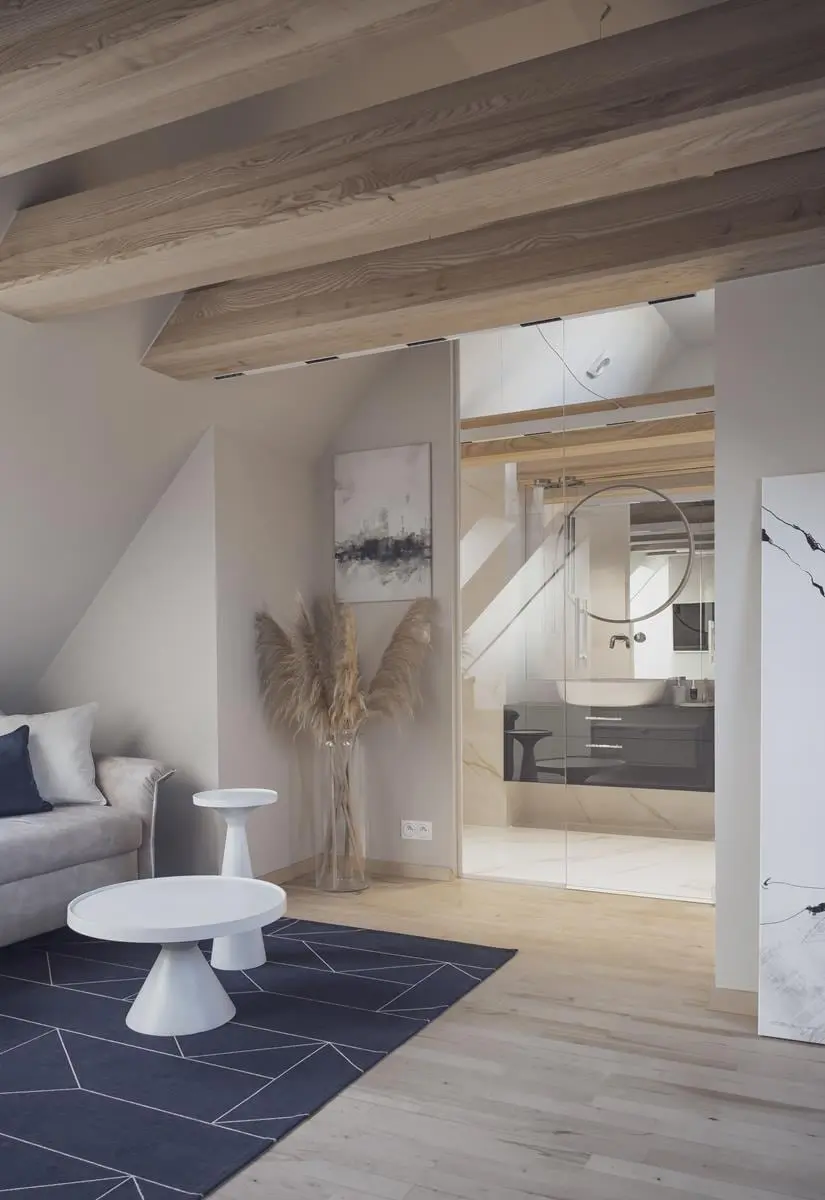 Niezwykle subtelną dekoracją w tej przestrzeni są suche trawy, które wprowadzają do wnętrza klimat boho, a jednocześnie doskonale wpisują się w styl nowoczesny, który dominuje w zielonogórskim mieszkaniu na poddaszu. Przytulny nastrój wprowadzają również dodatki tekstylne, które dodatkowo „zmiękczają” aranżację. W projekcie znalazło się miejsce również na drewno. Widać je szczególnie na starych belkach sufitowych, których kolorystyka nawiązuje do podłogi.