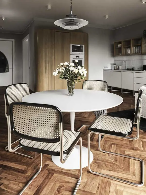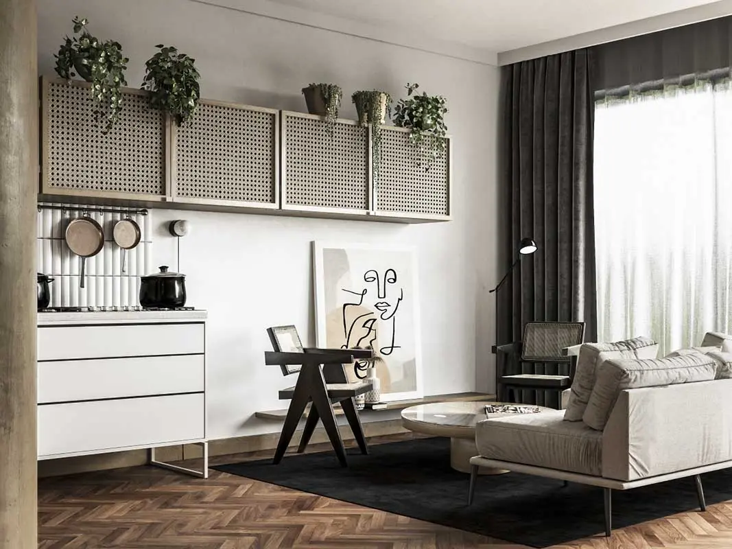 Właściciele 72-metrowego mieszkania na warszawskim Żoliborzu, chcieli urządzić wnętrze w funkcjonalny oraz ponadczasowy sposób. Architekci z Noreststudio zaproponowali więc rozwiązania, które nigdy nie wychodzą z mody. Kolorystykę opartą na ciepłych neutralach: złamanych bielach, beżach oraz brązach, przełamują akcenty czerni i ciemnej zieleni. Wśród materiałów dominuje drewno o miodowym wybarwieniu. Wyposażenie nawiązuje do modernizmu i ikonicznych mebli tego okresu. Przy stole jadalnianym znajdują się krzesła typu Cesca, zaprojektowane przez Marcela Breuera. Natomiast nad nim zamontowana jest lampa nawiązująca do słynnego modelu PH marki Louis Poulsen. Architekci zaproponowali do strefy salonu, dwa fotele projektu Pierra Jeannereta z 1954 roku. Ciekawymi elementami dekoracyjnymi jest słynna figurka ptaka z Vitry oraz plakat Bauhausu w sypialni. Oryginalnym meblem jest również drewniana zabudowa kuchenna o zaokrąglonych bokach, która przywodzi na myśl organiczne formy popularne w latach 60.