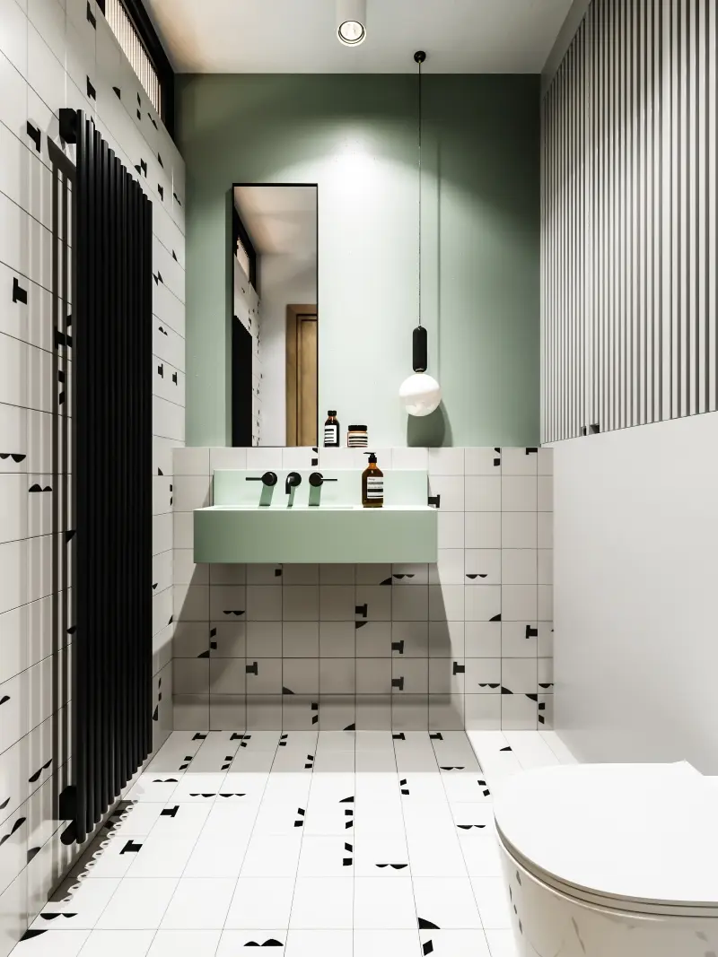 Architekci zadbali, by aranżacja przy wielu nawiązaniach do okresu modernizmu, była również mocno osadzona we współczesności. Wyrazem tego jest aneks kuchenny z minimalistyczną zabudową. Białe szafki na metalowych płozach, nadają lekkości i wtapiają się w przestrzeń strefy dziennej. Ciekawym zabiegiem jest pokrycie ściany nad blatem wypukłymi płytkami typu cegiełka. Współczesne rozwiązania zostały w pełni wykorzystane w łazience, gdzie króluje czerń i biel w towarzystwie Neo Mint. Tutaj główną rolę grają płytki z minimalistycznymi worami. Pochodzą one z kolekcji Pack, włoskiej marki 41zero42.