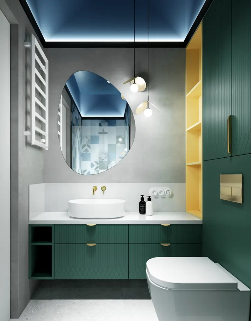 We wnętrzu dominują głęboka zieleń i granat. Kompozycję uspokajają betonowe płytki. Złote detale, takie jak armatura, oświetlenie czy przycisk wc, nie tylko spełniają praktyczne funkcje, ale też stanowią swoistą biżuterię łazienki.